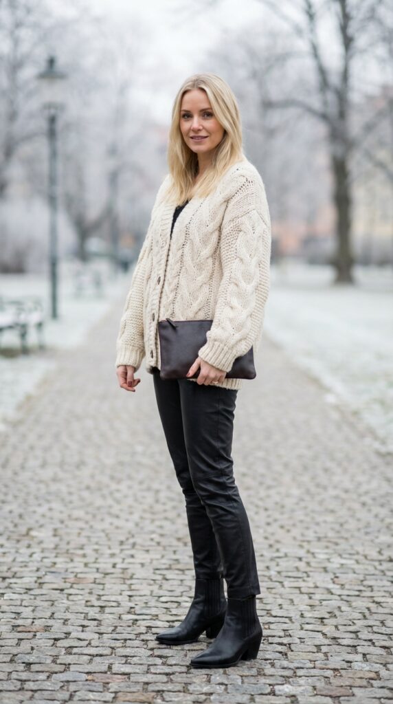Choose a cardigan in cream, camel, or soft gray to complement black leather pants. The sleek silhouette of fitted leather creates a stunning contrast against the cardigan’s relaxed drape.