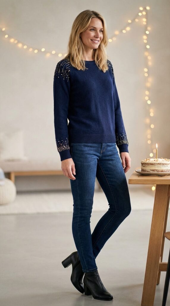 Dark wash jeans are your secret weapon here. They’re dressier than lighter washes and create a sleek silhouette that balances the sweater’s texture. Block heel boots complete this winning combination, offering comfort for birthday celebrations while maintaining a stylish vibe.