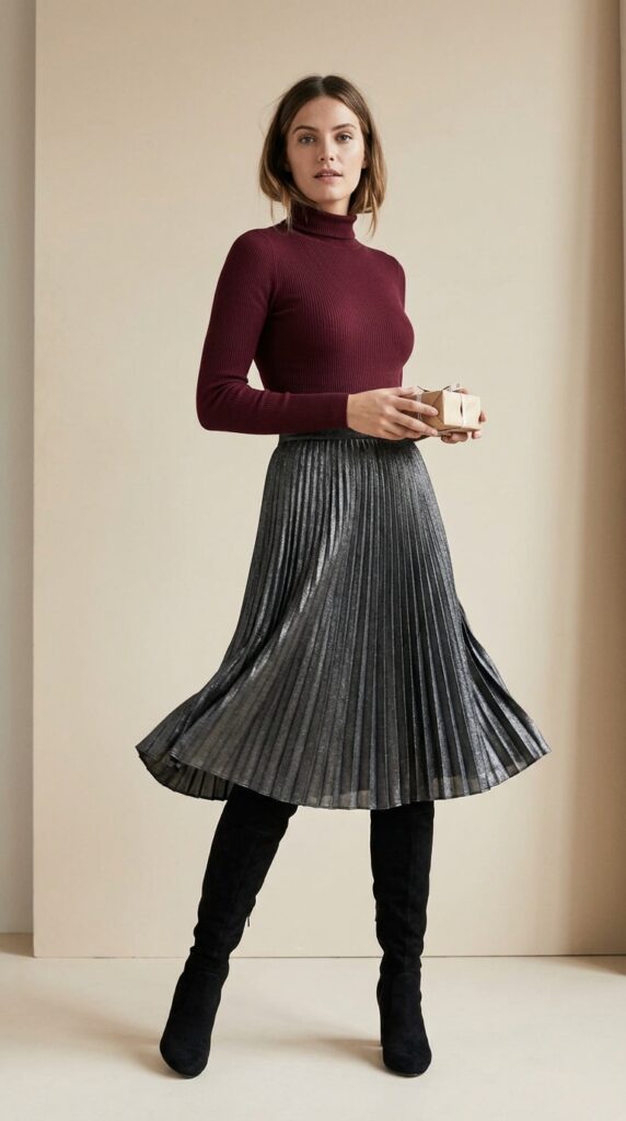 Choose a fitted bodysuit in rich burgundy or forest green – these graceful knitwear combinations work beautifully against winter’s backdrop. The pleated midi adds movement and visual interest, especially in metallic fabrics or jewel tones. Beautiful 28th birthday outfit inspirations can provide additional style ideas for this occasion.