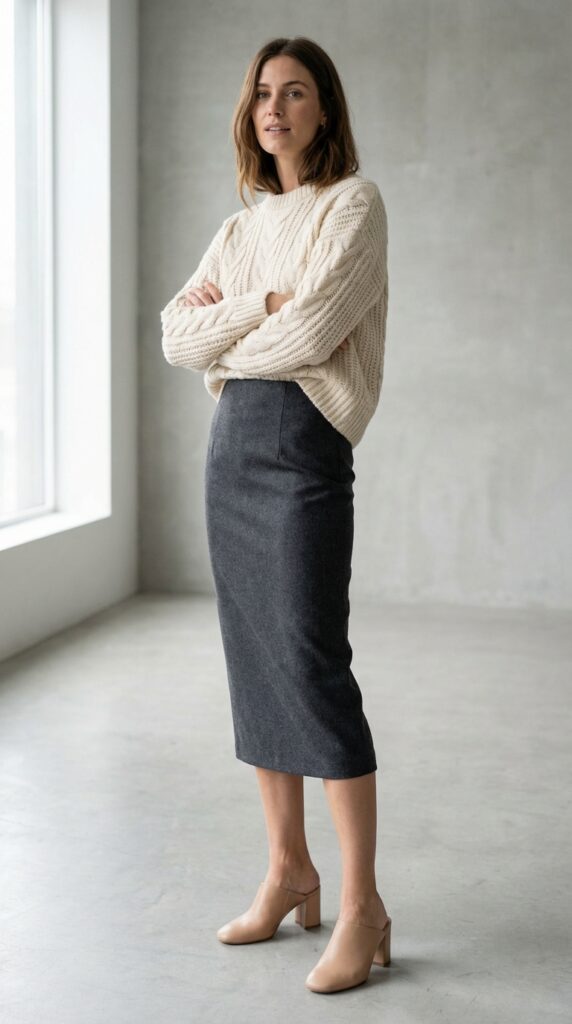 The beauty of layered textures here is subtle contrast. Your chunky knit provides visual interest against the skirt’s smooth lines. Stick to a monochromatic palette or try complementary neutrals like cream and camel for maximum impact.