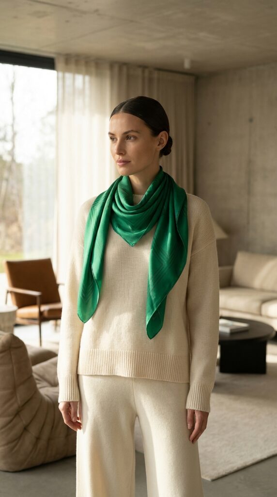 The beauty of this approach is how the scarf creates a graceful silhouette while adding visual interest to clean lines. You can tie it loosely for a relaxed vibe or create a structured knot for more polish.
