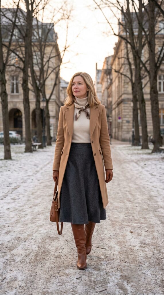 This cozy layering approach creates visual interest while keeping you warm during those February celebrations. The complementing neutrals work harmoniously – camel’s warm undertones soften the structured silhouette of your skirt while adding sophisticated polish.