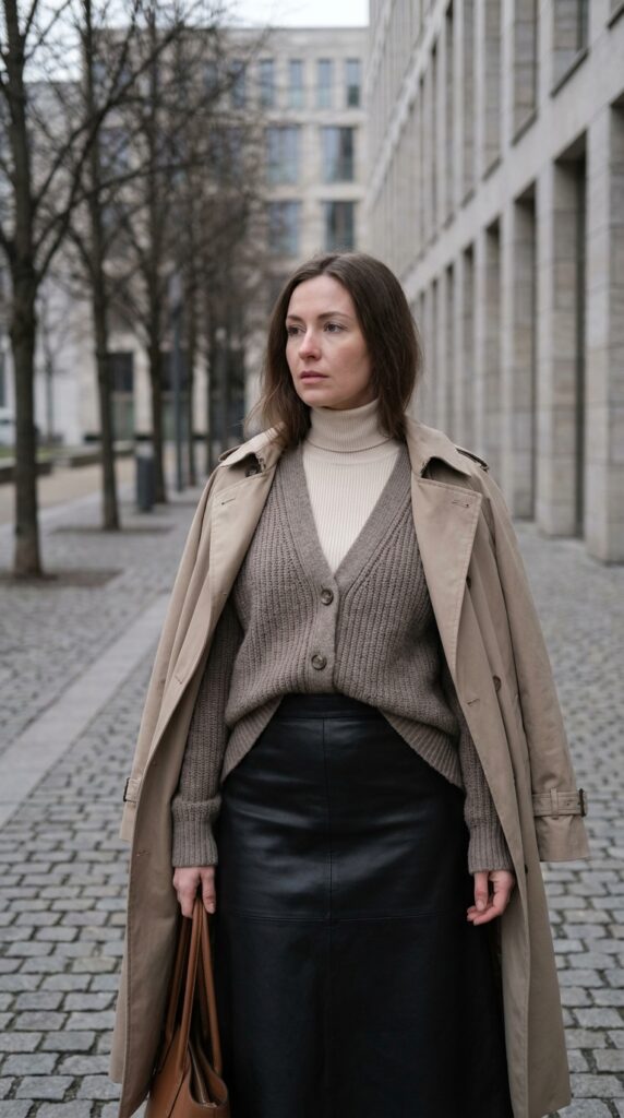 Few outfits capture that perfect winter birthday vibe quite like layered knits paired with a sleek leather skirt and timeless trench coat. This combination strikes that sweet spot between sophisticated and approachable – exactly what you want when celebrating another year around the sun.