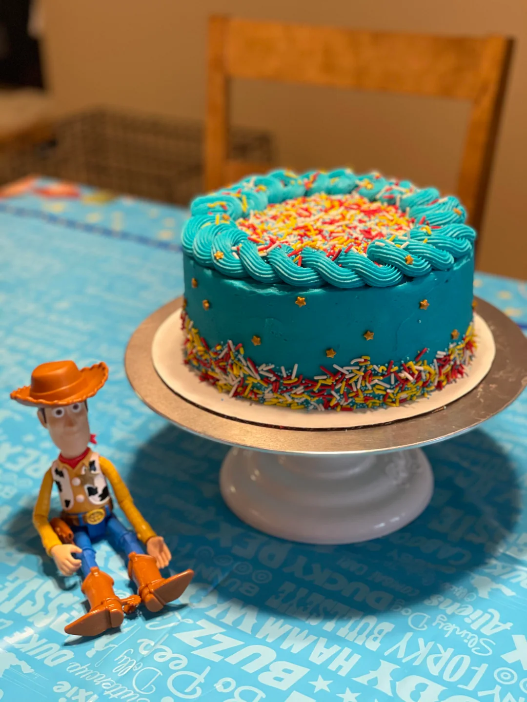 This Toy Story-themed cake is both fun and simple, featuring Woody from the Toy Story franchise sitting next to the cake. The bright blue icing and colorful sprinkles add excitement, while the cake design keeps it playful and clean. This cake is a great option for any Toy Story fan!