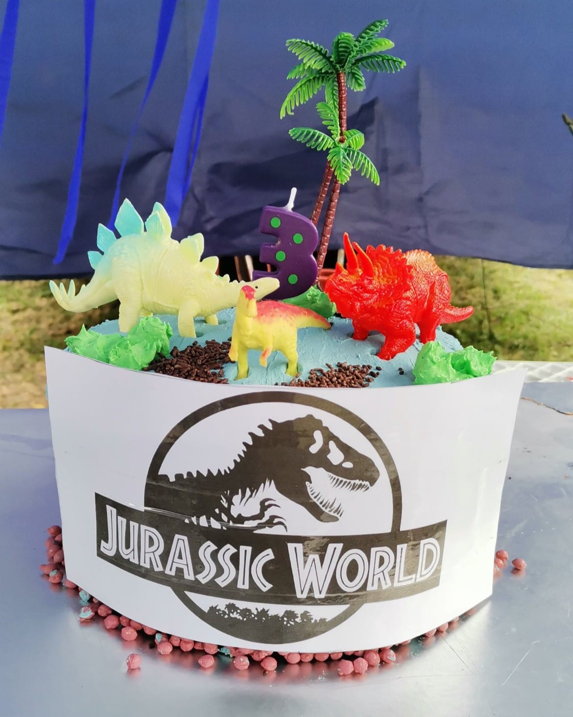 This Jurassic World cake features playful dinosaur figurines and a vibrant 3 topper. The bright colors, like green and blue, match the theme of a prehistoric world, while the palm tree and chocolate rocks add extra flair. The cake brings the world of dinosaurs to life in a fun and adventurous way.