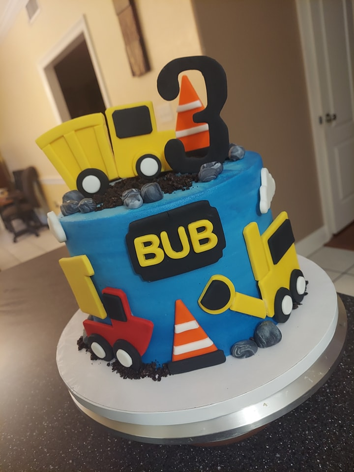 This construction-themed cake is perfect for a boy who loves big machines! The cake features construction vehicles like dump trucks and excavators, with bold yellow and red colors that represent a busy construction site. The “3” topper is surrounded by fun, edible rocks and traffic cones to complete the construction scene.
