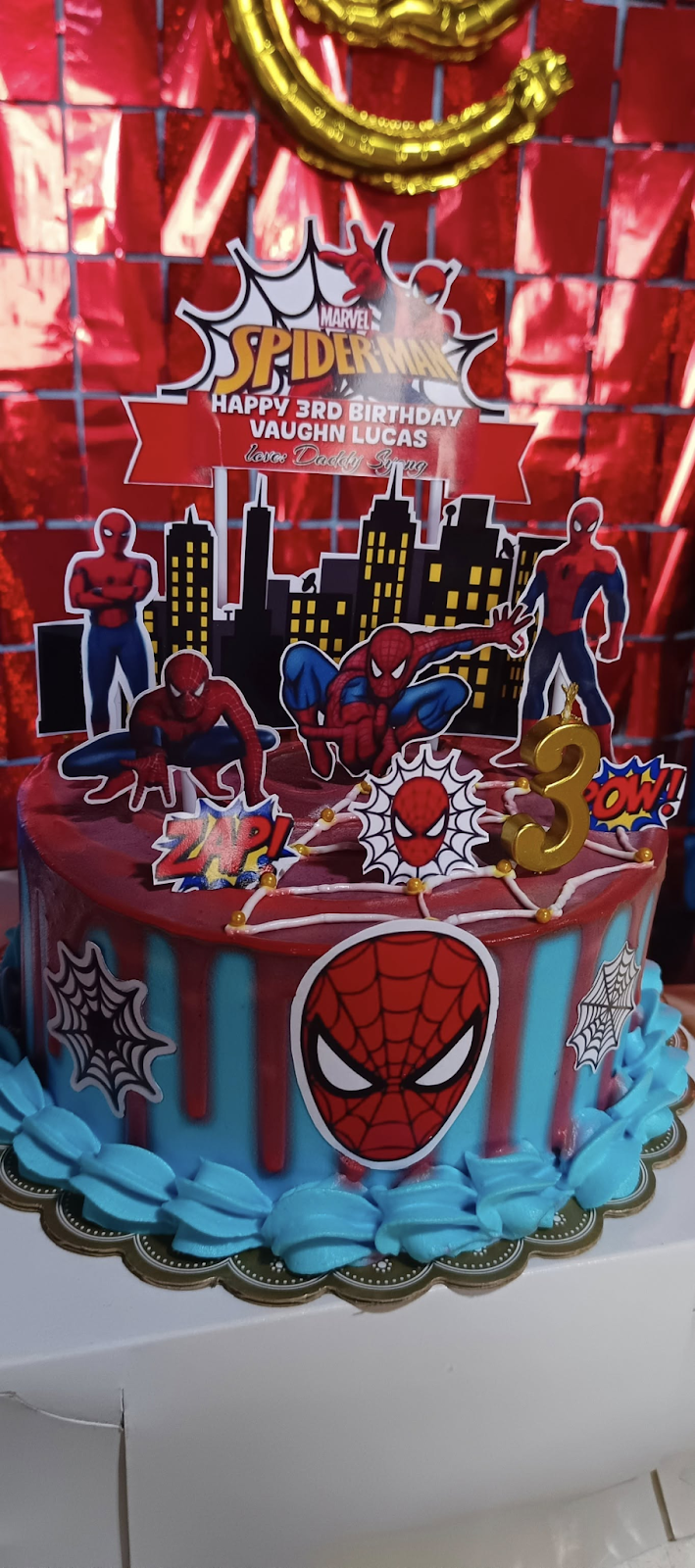 This vibrant Spiderman cake is perfect for a little superhero fan! The top features Spider-Man action figures and playful comic-style elements like “ZAP!” and “POW!”. The deep red and blue colors create an eye-catching effect, while the golden number 3 adds a fun, celebratory touch. This cake will surely delight any Spider-Man enthusiast!