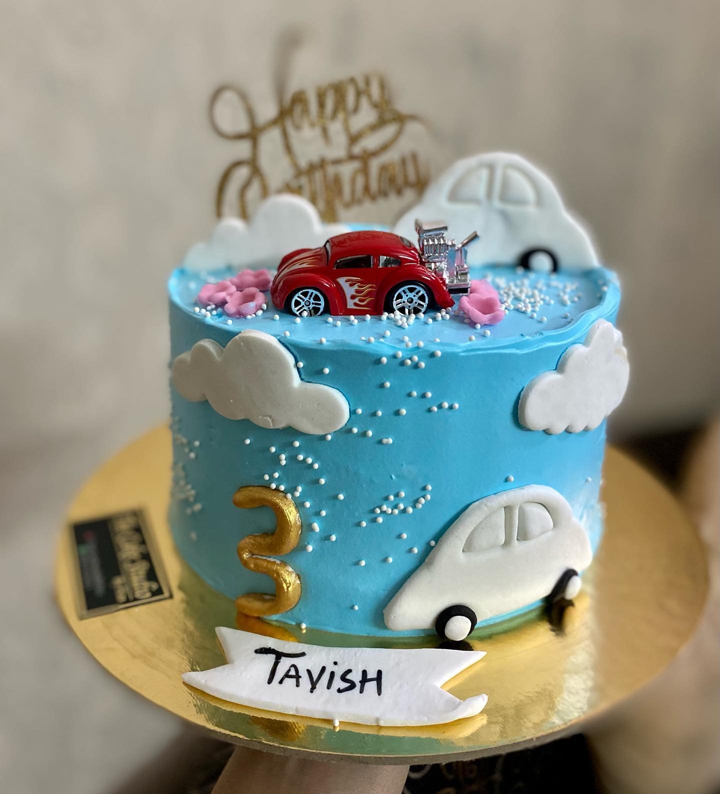 This adorable car-themed cake features a red car figurine atop a blue icing base, with white clouds and soft pink decorations surrounding the cake. The golden “3” adds a festive touch, and the playful designs on the cars make this cake ideal for little ones who love vehicles.