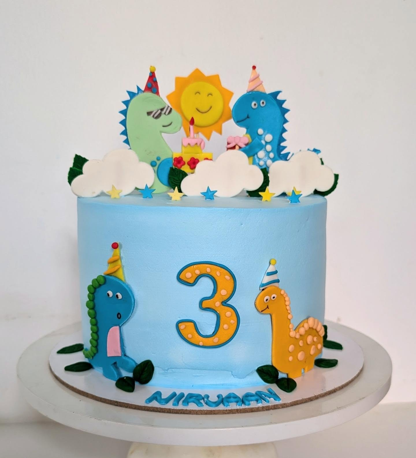 This dinosaur-themed cake features fun dinosaur figurines and bright colors like blue, yellow, and green. The playful cake design includes fun elements like a smiling dinosaur, a colorful sun, and festive clouds, making it perfect for a child who loves dinosaurs.
