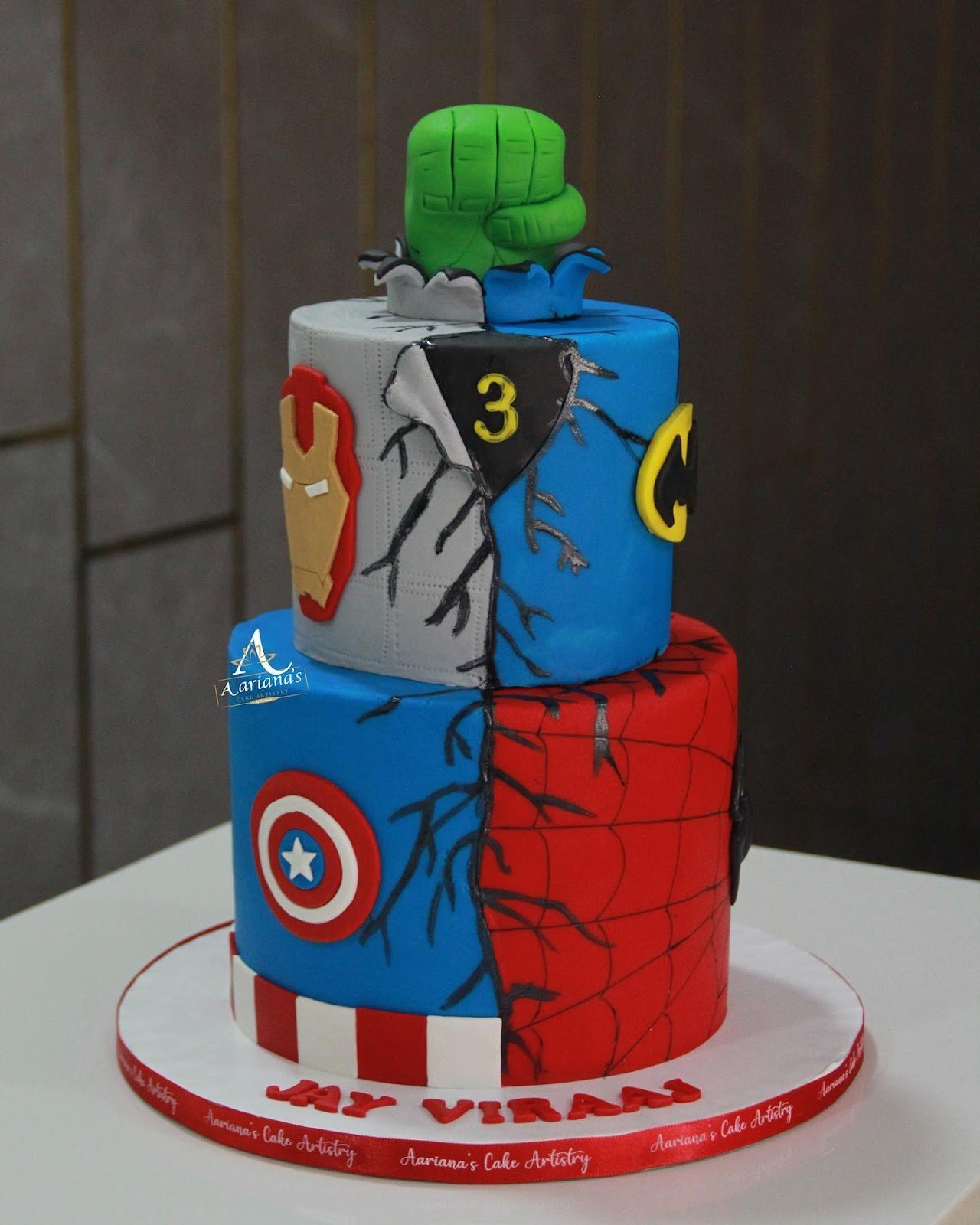 This superhero-themed cake is a vibrant celebration of all things Marvel! Featuring iconic characters like Captain America, Spider-Man, and the Hulk, the colorful design captures the spirit of action and excitement. The cake’s bold blue, red, and yellow colors bring the superheroes to life, making it the perfect centerpiece for any superhero-loving child.