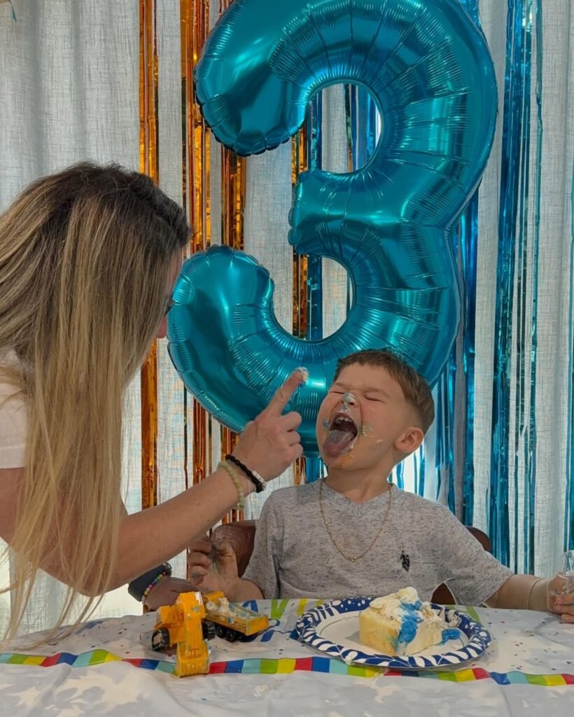 A candid and humorous moment is captured as a young boy, covered in cake and frosting, is playfully having a cake fight with his mother, with a large blue number 3 balloon in the background.