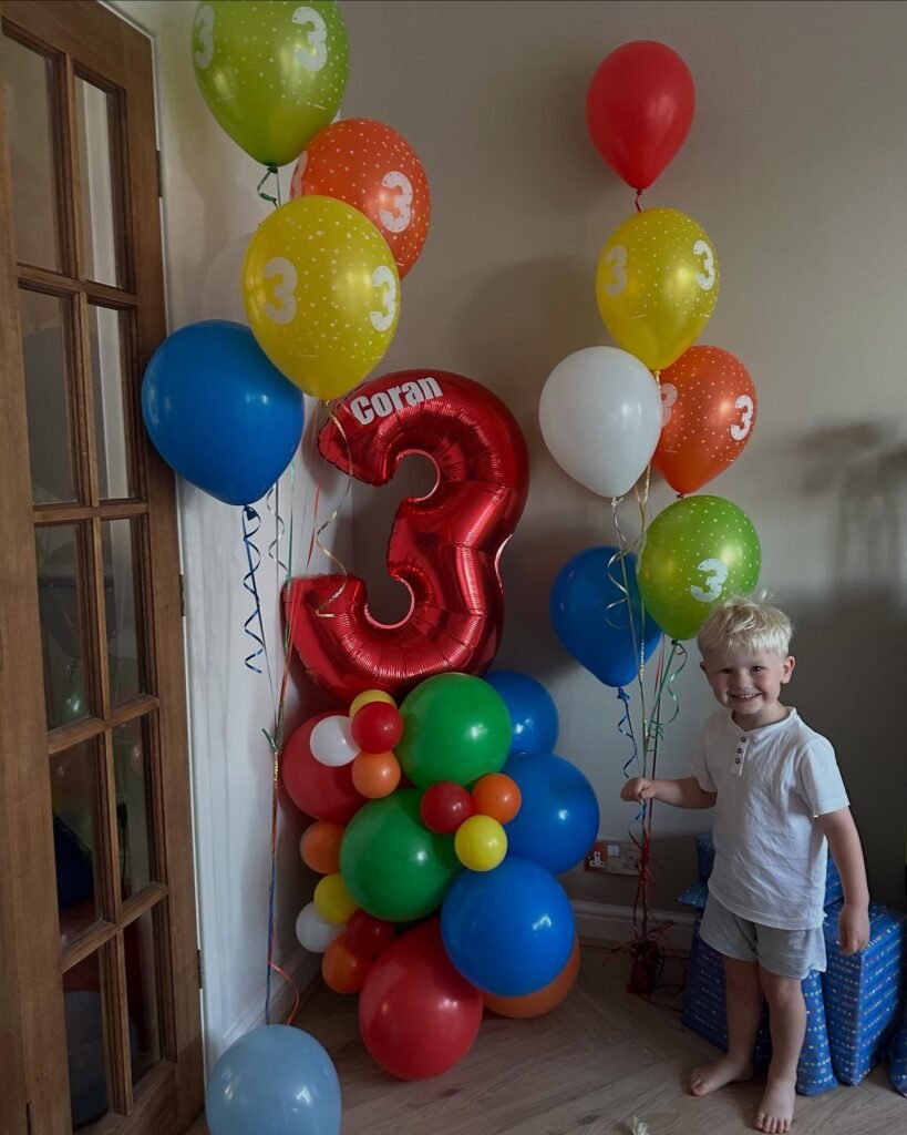 In this vibrant birthday setup, a young boy is surrounded by a variety of colorful balloons, including a large red number 3 balloon. The balloons in blue, green, red, and yellow shades create a festive vibe, while the boy, smiling in excitement, stands beside them.