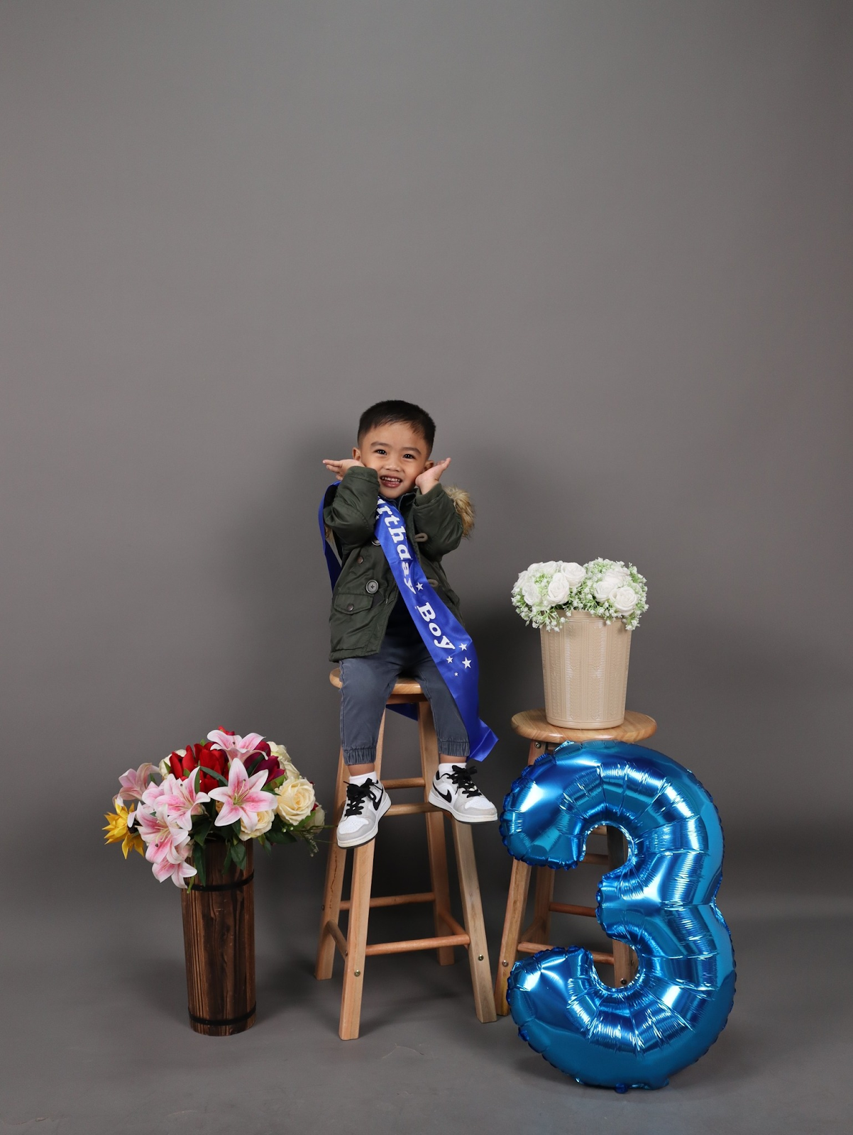 This heartwarming photo captures a young boy joyfully posing in front of a large blue number 3 balloon, surrounded by fresh flowers and a minimalist backdrop.