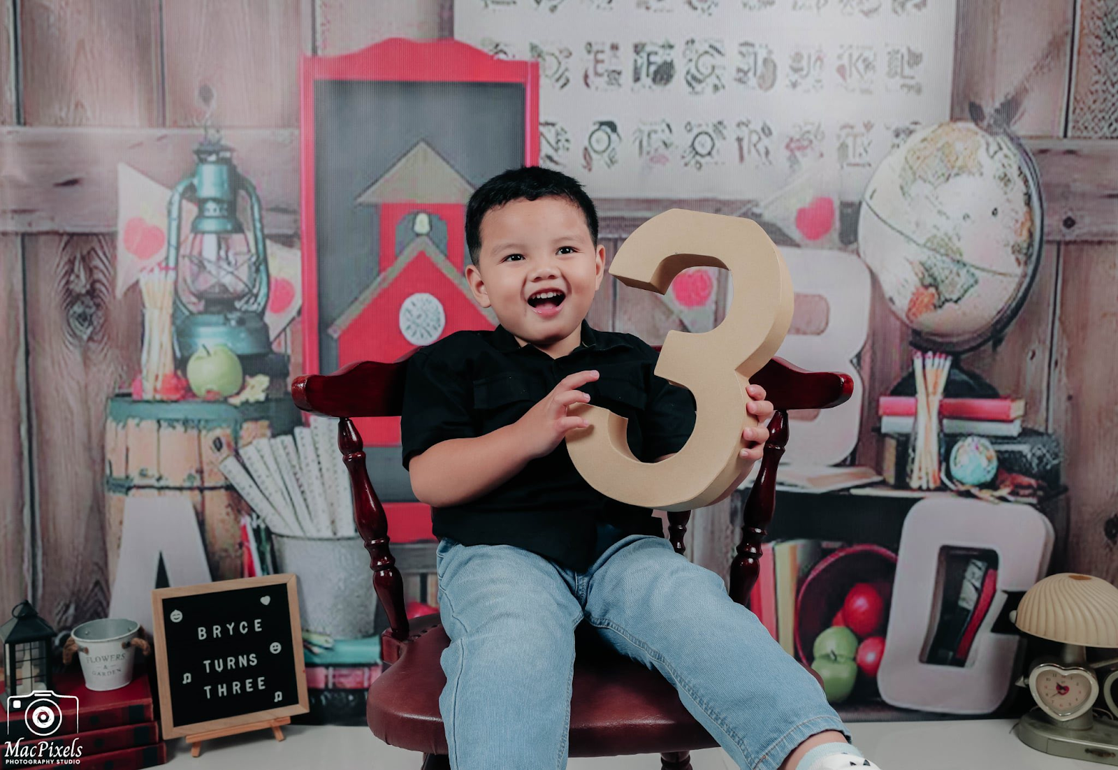 In this charming, rustic-themed birthday photo, a young boy holds a large cardboard number 3 while sitting on a wooden chair.