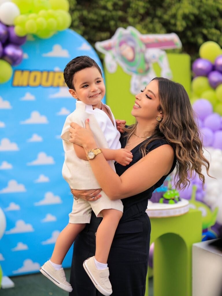 This captivating moment features a mother holding her son, who is dressed in a stylish outfit, while a blue and purple balloon arch frames the background. The son’s happy expression as he is lovingly embraced by his mother adds warmth and affection to the photo.