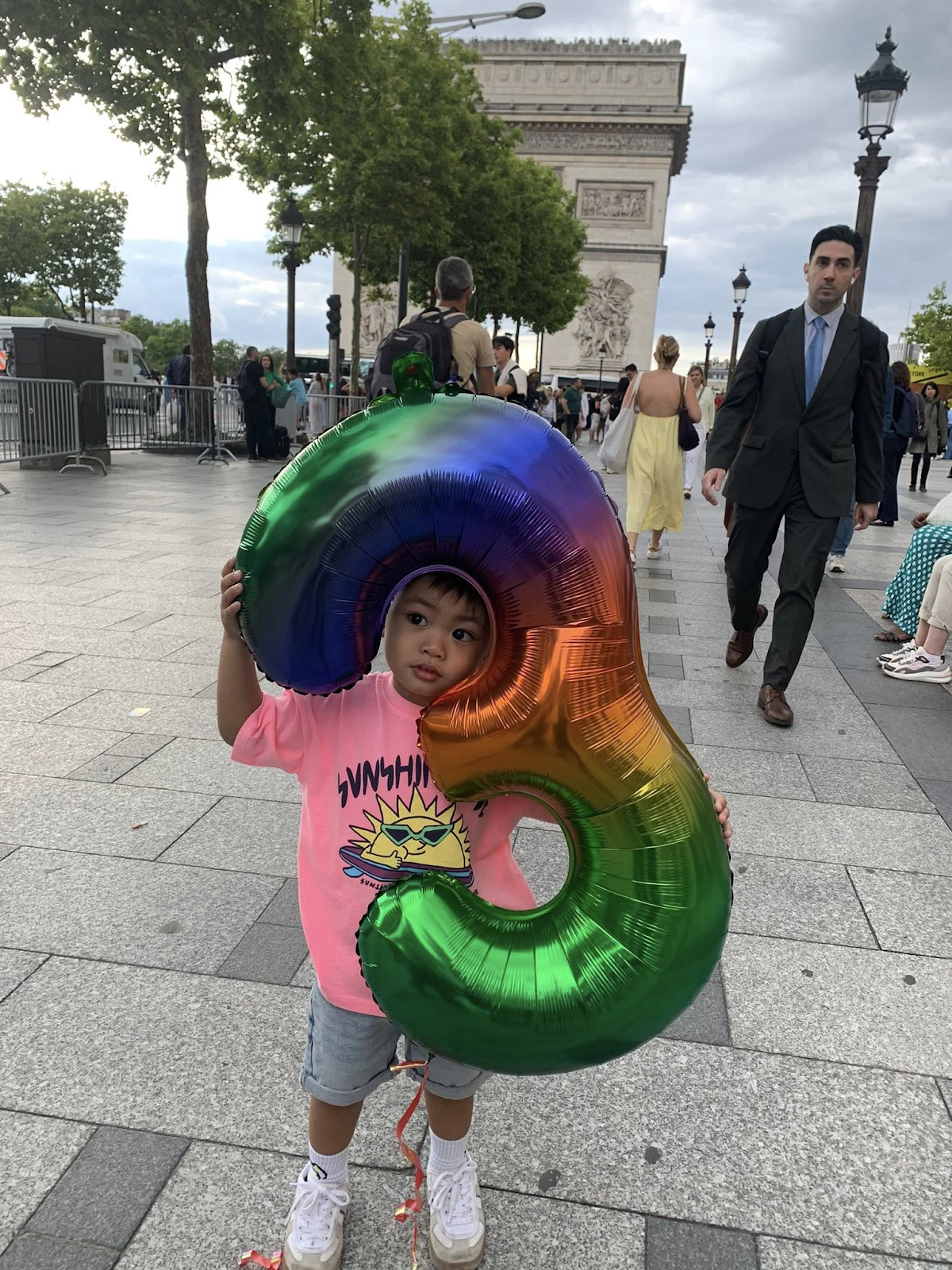 This photo shows a young boy standing proudly on the streets of Paris, holding a rainbow-colored number 3 balloon. Behind him, the famous Arc de Triomphe adds an iconic touch to the scene, creating a beautiful contrast between the vibrant balloon and the classic architecture.