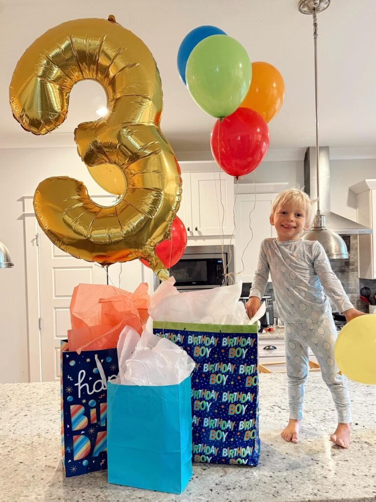 In this delightful birthday setup, a young boy stands next to several colorful gift bags, with a giant gold number 3 balloon floating above. Bright red, blue, and yellow balloons fill the background, creating a festive and cheerful atmosphere. The boy, dressed in soft pajamas, appears excited about the surprises awaiting him.