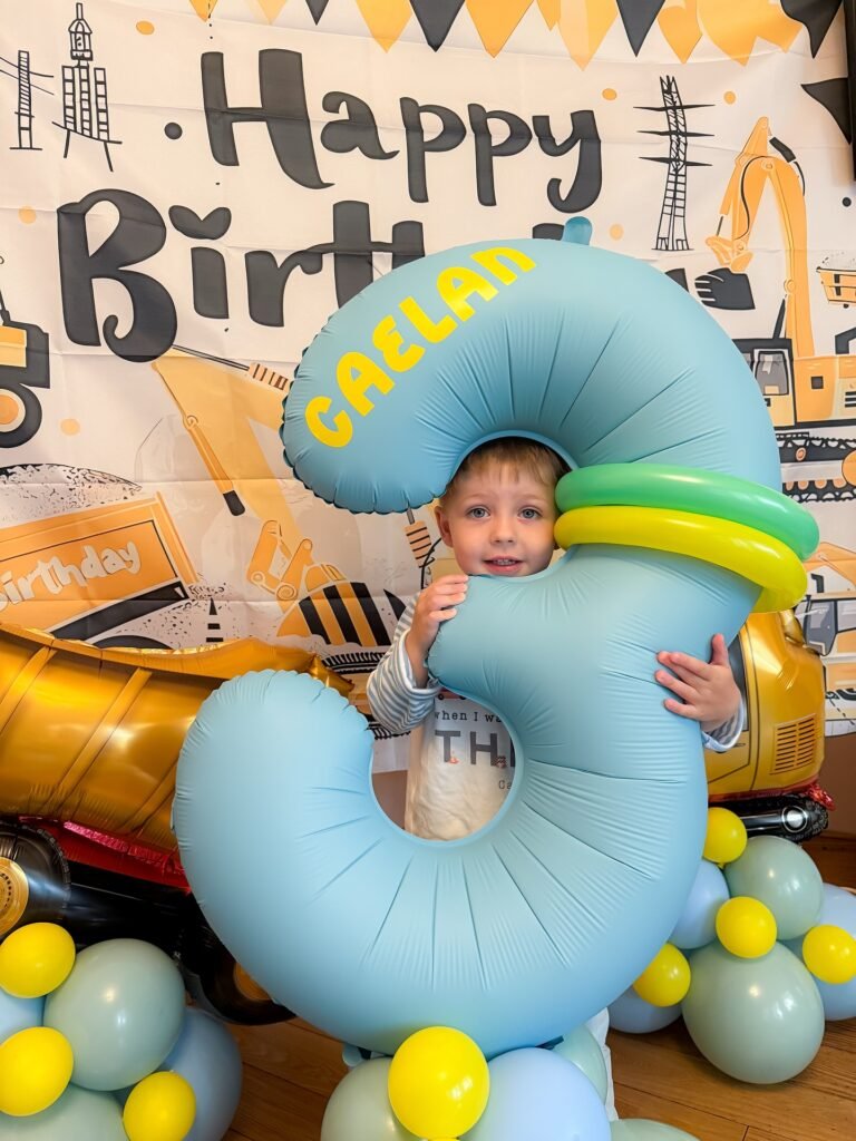 This adorable moment captures a young boy standing happily with a large, soft blue number 3 balloon. The festive background features a bright birthday banner and colorful balloons, setting a joyful tone for the celebration.