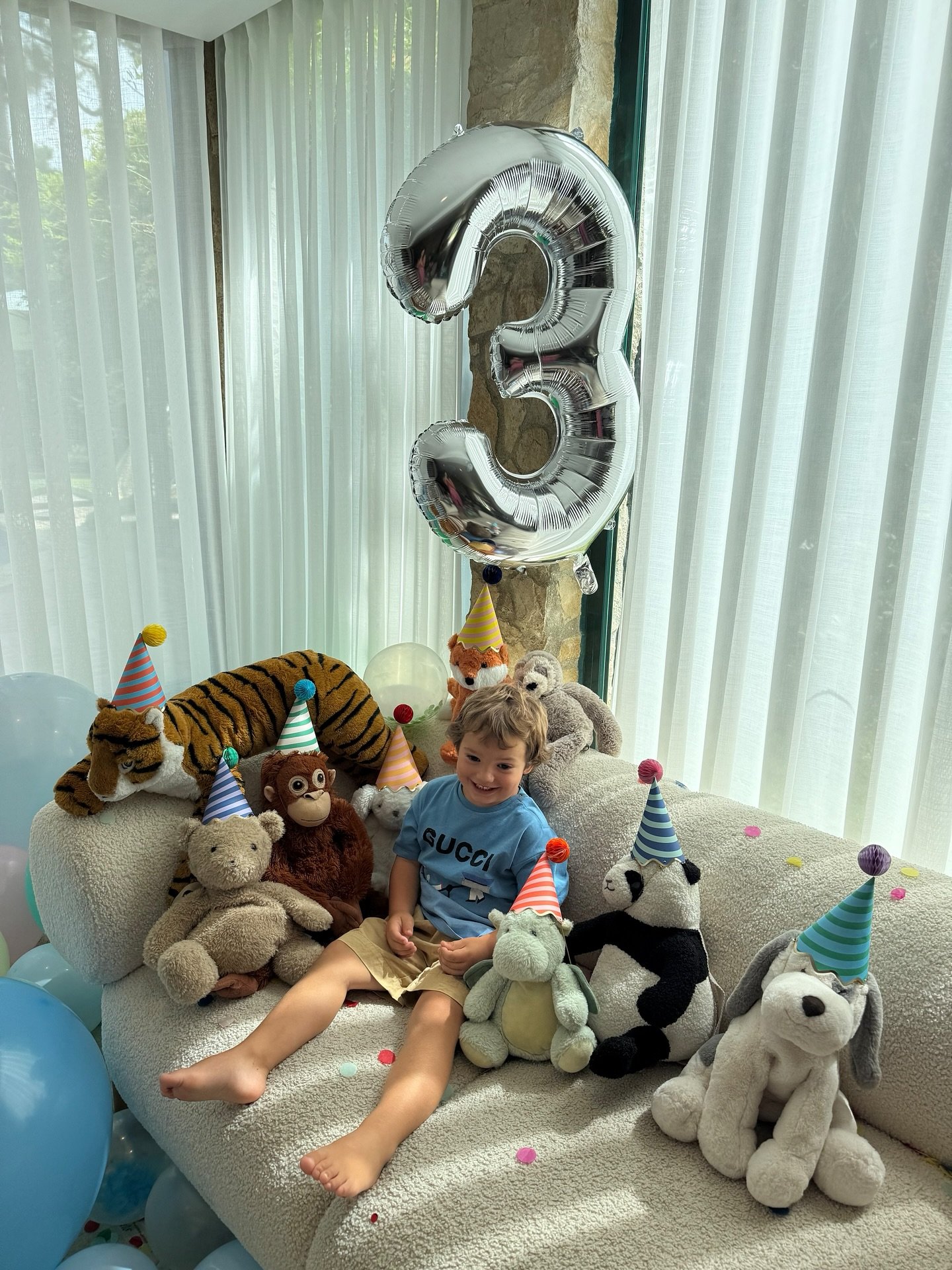 A charming photo of a young boy surrounded by his favorite stuffed animals, each one wearing a party hat. The shiny silver number 3 balloon behind him adds a festive touch, while the playful collection of animals brings warmth to the scene.