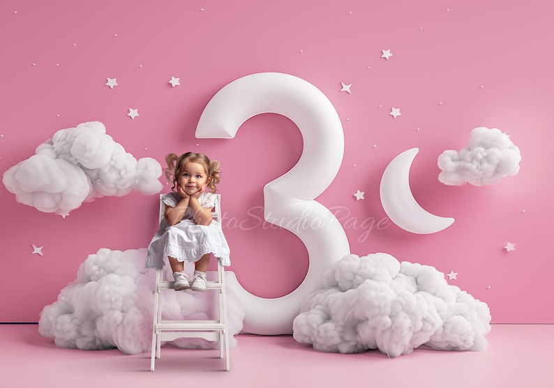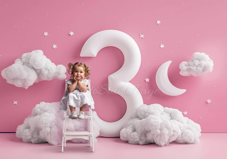 The whimsical cloud and star theme create a dreamy, fantasy-like setting, making this image the perfect representation of a child’s imagination on their special day. The soft colors and adorable pose highlight the innocence of turning three.