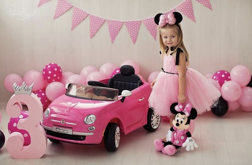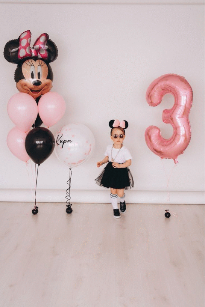 This photoshoot highlights Minnie Mouse props, bows, and balloons.