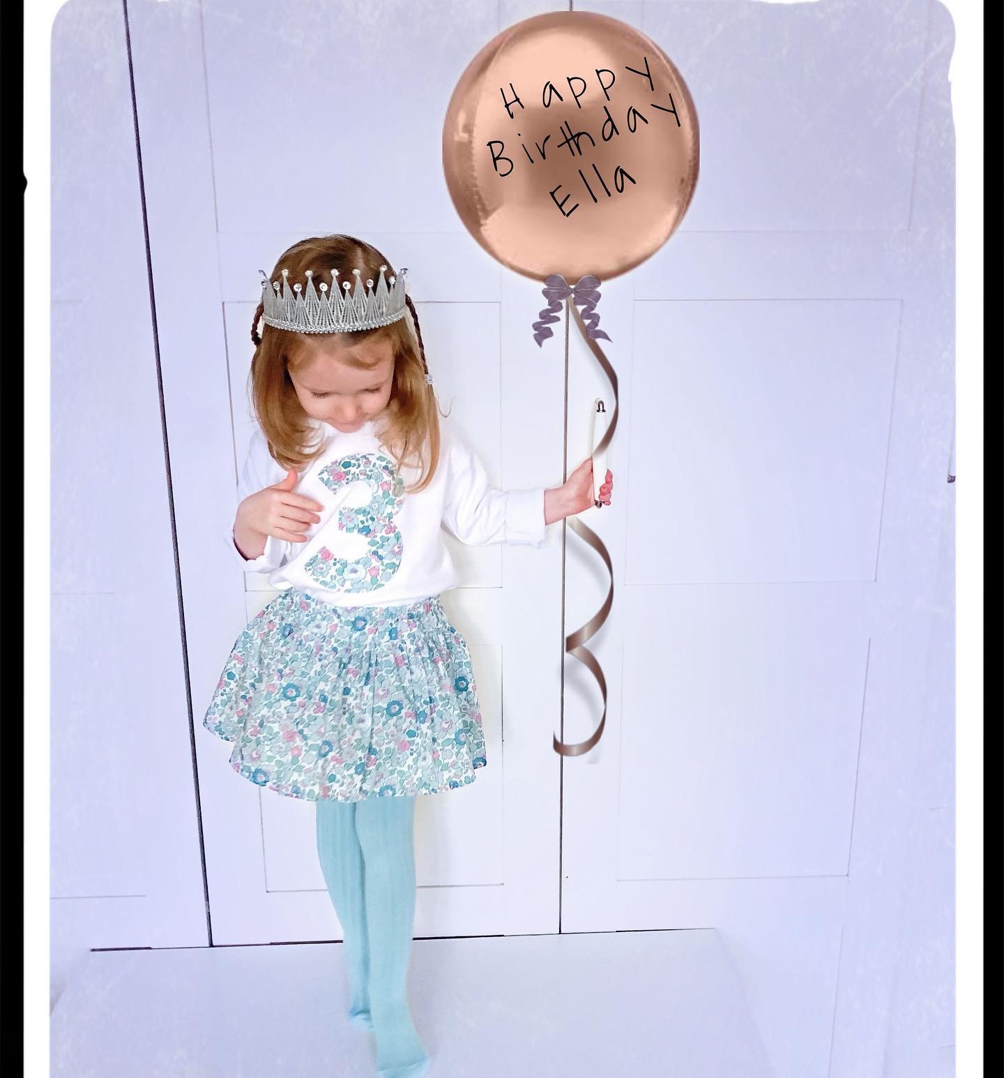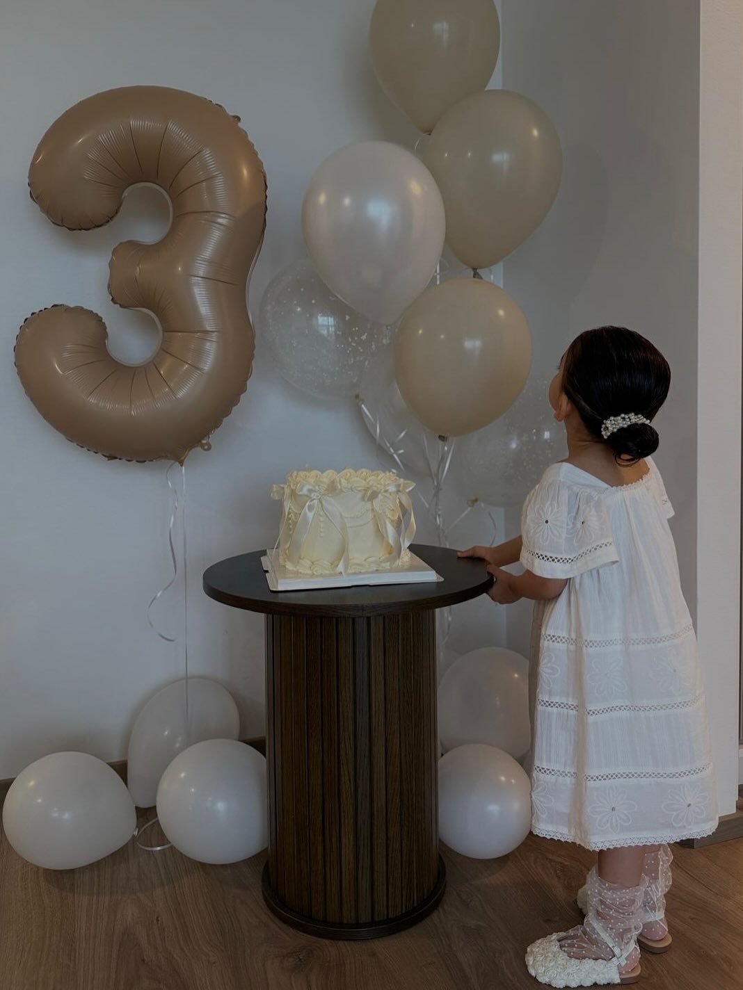 The pastel-colored balloon adds a festive touch, while her attire keeps the image light and fun. This moment reflects the innocence and excitement that come with celebrating a milestone like turning three.