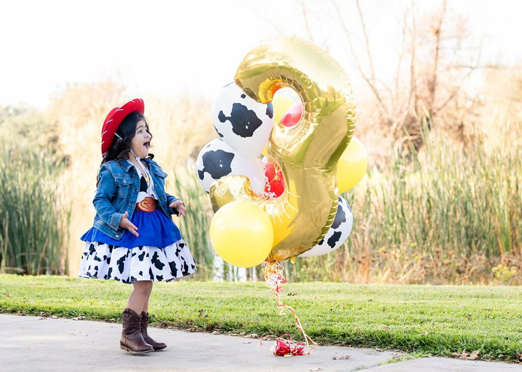 A cowgirl-themed birthday moment with this little one rocking a red hat, denim jacket, and cow-print skirt, holding a large gold “3” balloon. The natural outdoor setting adds an adventurous touch, while her enthusiastic pose shows the fun she’s having. The yellow and red balloons tie the whole scene together, making this a picture-perfect moment for a wild west-inspired 3rd birthday.