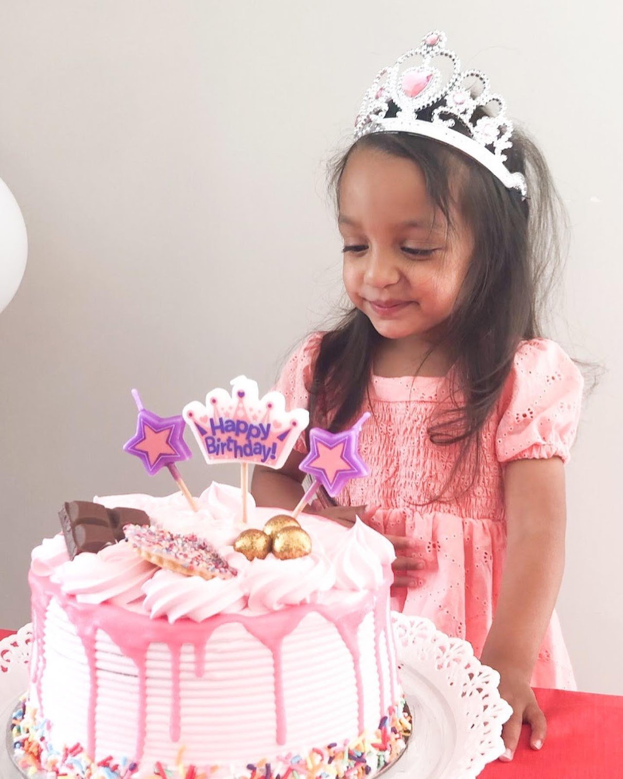 The birthday girl, crowned in a tiara, stands proudly in front of her pink birthday cake. The playful decorations, including dripping icing and fun cake toppers, add to the charm of the moment. Her smile is contagious, radiating happiness.