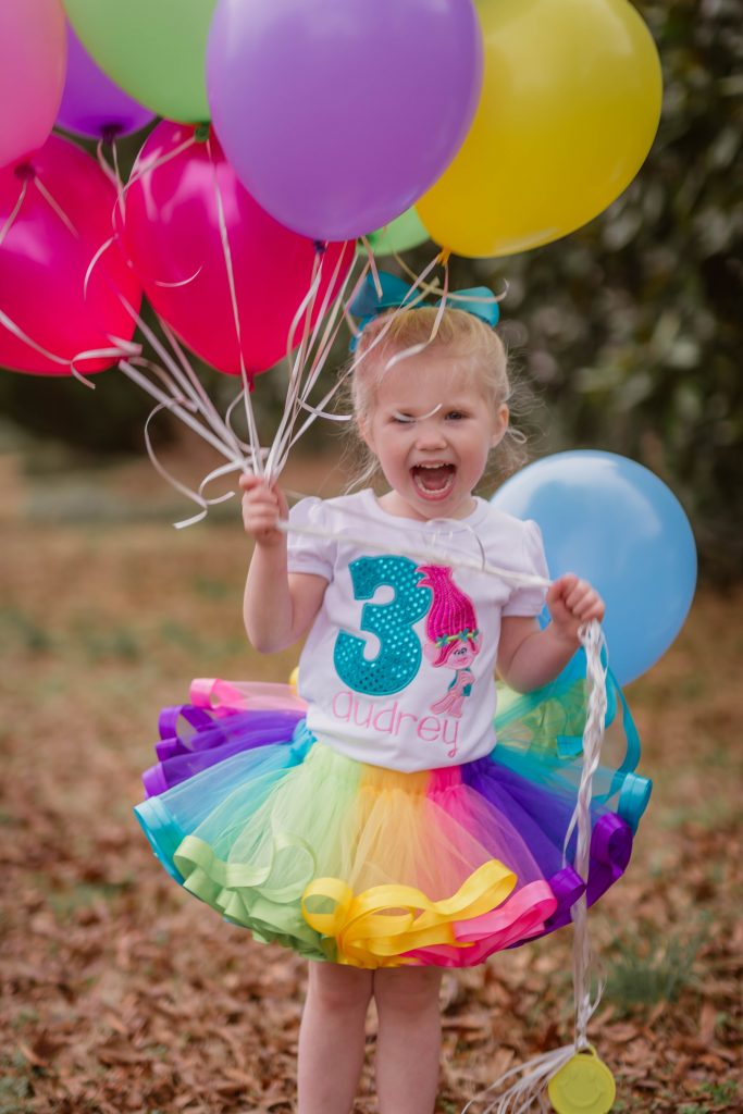 The rainbow tutu skirt and bold colors emphasize the happy and carefree spirit of turning three. This image captures the playful side of a 3rd birthday celebration.