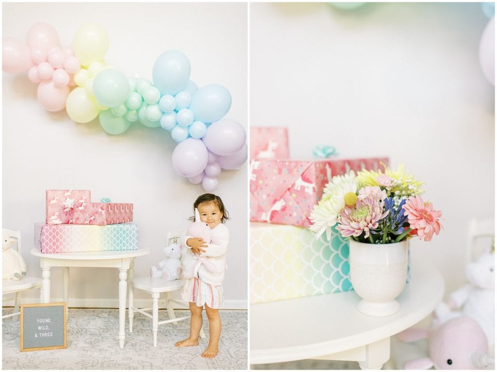 This vibrant image captures the playful essence of a 3rd birthday party. The little girl holds a soft white stuffed animal, nestled next to a colorful balloon arch that creates a cheerful atmosphere. The pastel rainbow backdrop, paired with pink gift boxes and bright floral arrangements, exudes a sense of joy and celebration.