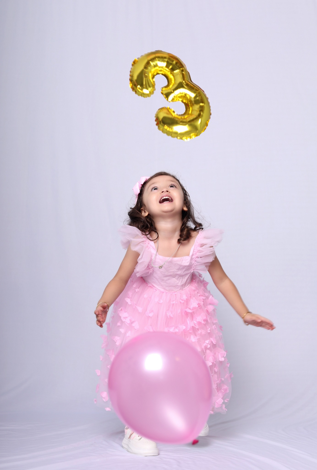 The pink balloon at her feet contrasts beautifully with the gold “3” balloon, giving the photo a fun yet elegant touch. The playful and light-hearted nature of this moment makes it ideal for a third birthday photoshoot.