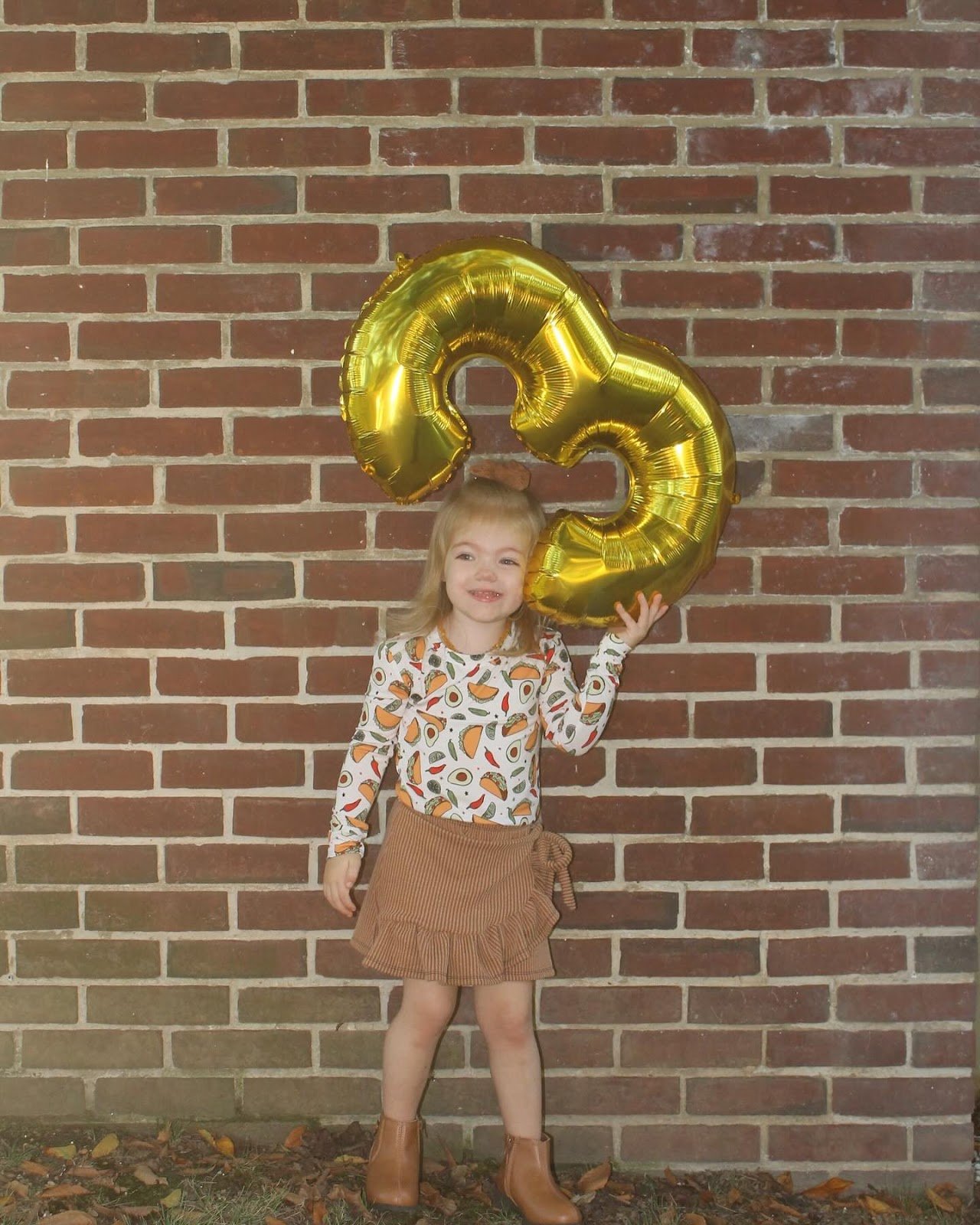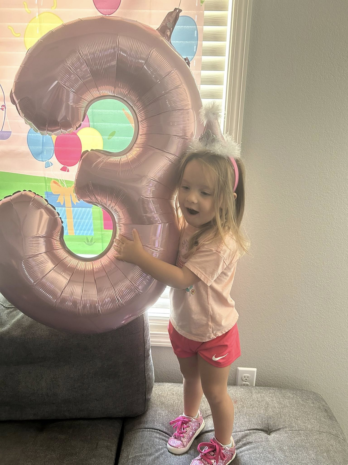 Her smile and the oversized balloon give this image an extra dose of cuteness, making it the perfect representation of a fun-filled 3rd birthday. The “3” balloon stands as a symbol of her growth.