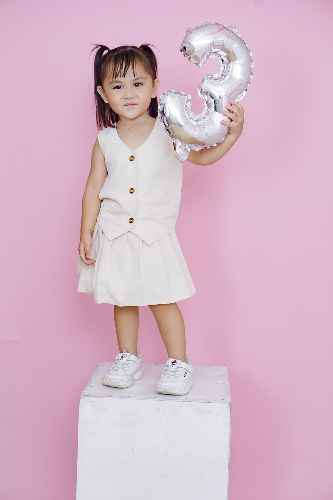 This photo features a sweet girl in a beige dress, holding a silver “3” balloon. The pink backdrop adds a pop of color, while her casual sneakers keep the vibe relaxed. Her confident stance showcases her personality, while the focus on the balloon highlights the special occasion.
