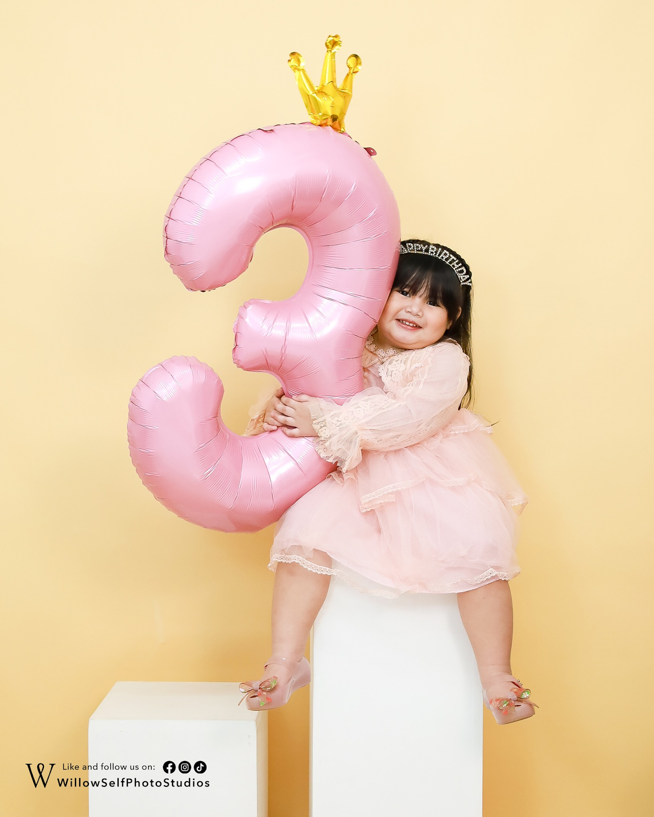 A precious moment captured with a little girl holding a pink “3” balloon. Dressed in a soft pink dress and a crown, she radiates joy and innocence. The light yellow backdrop adds warmth to the celebration, perfectly highlighting the royal touch of her birthday look.