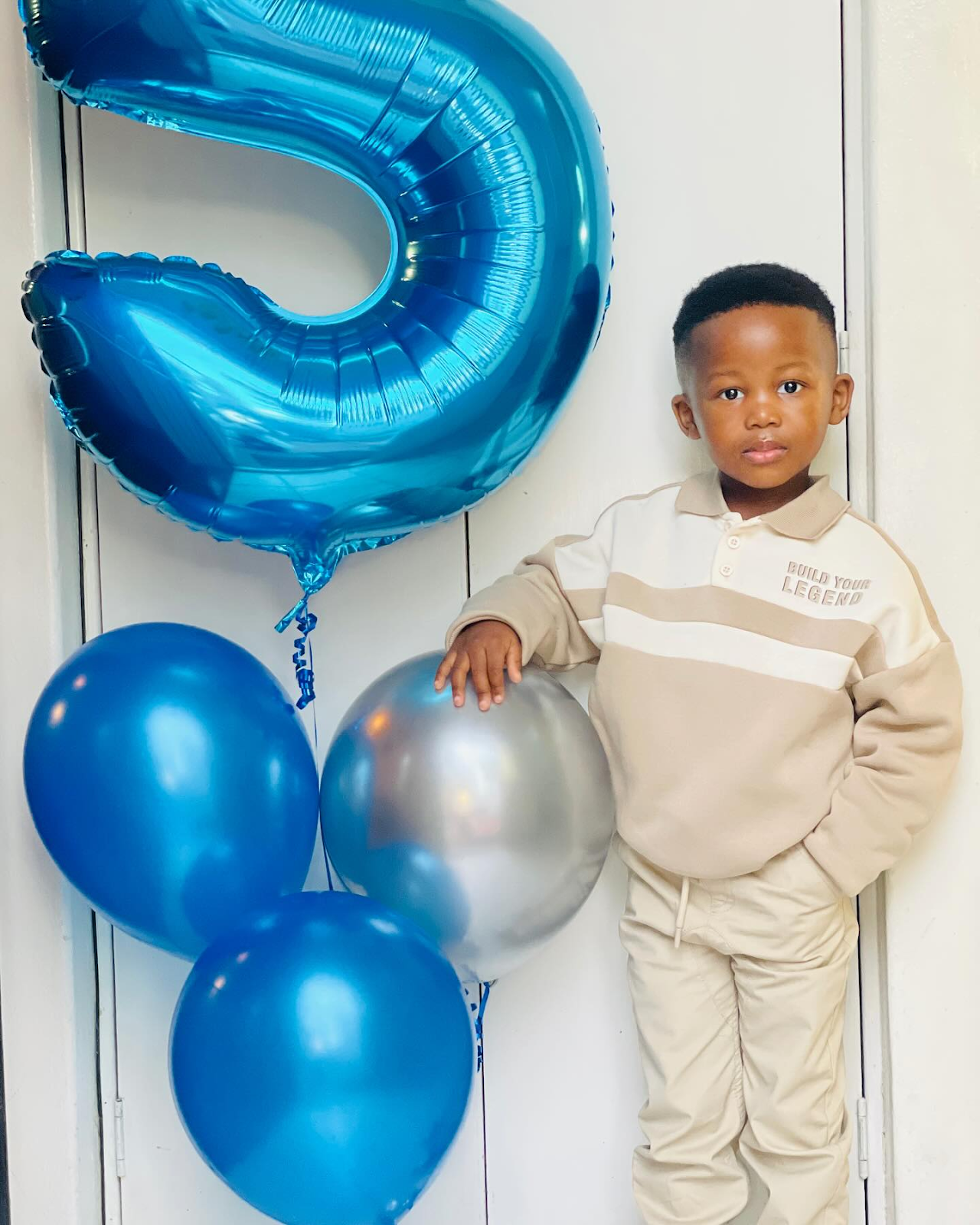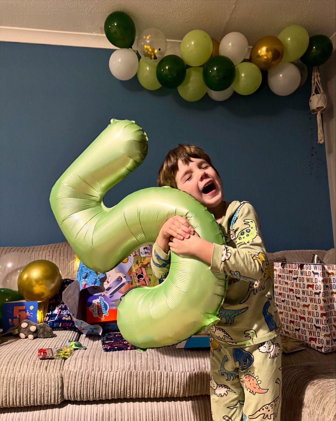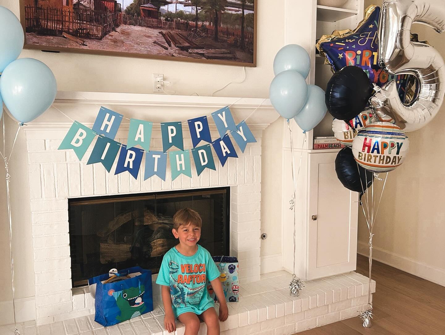 The vibrant balloons and birthday decorations bring the scene to life, capturing the happiness and energy of a young boy on his special day. It’s an excellent way to highlight the joy of turning five colorfully.