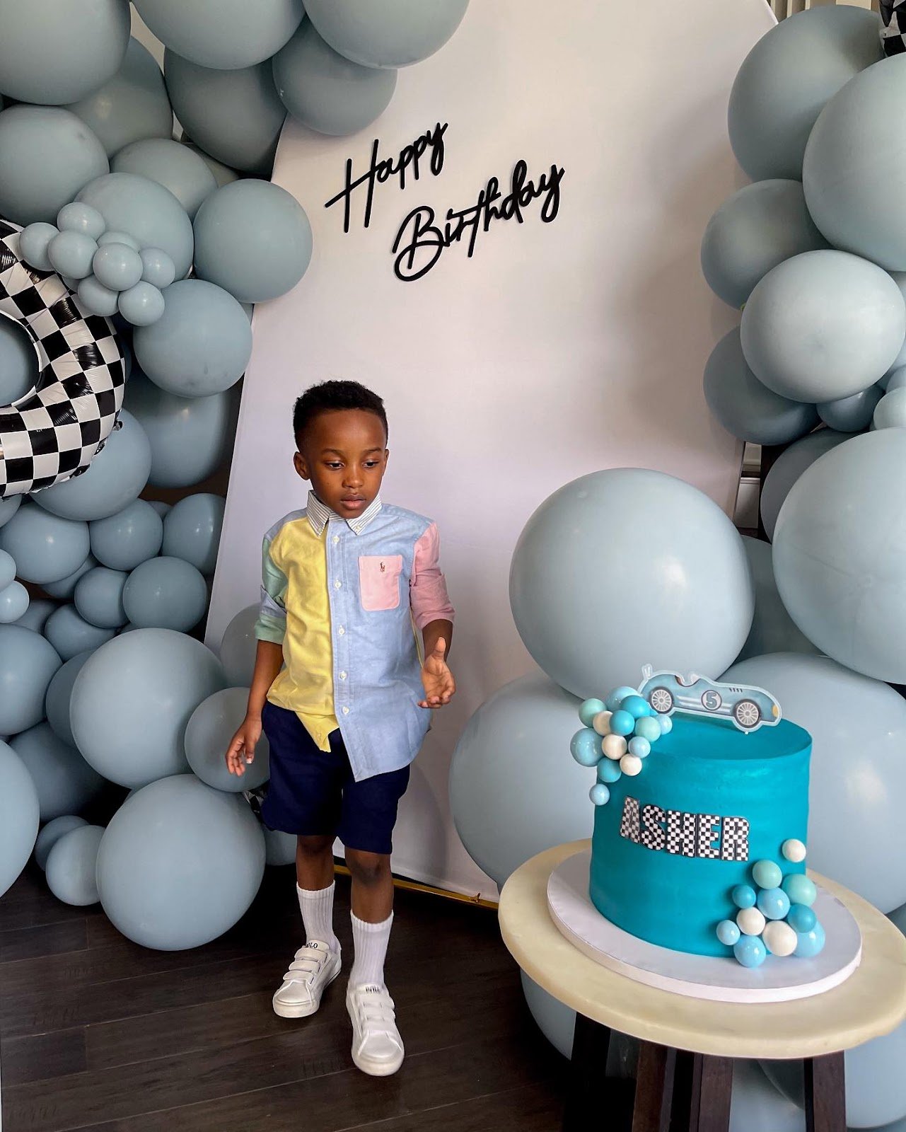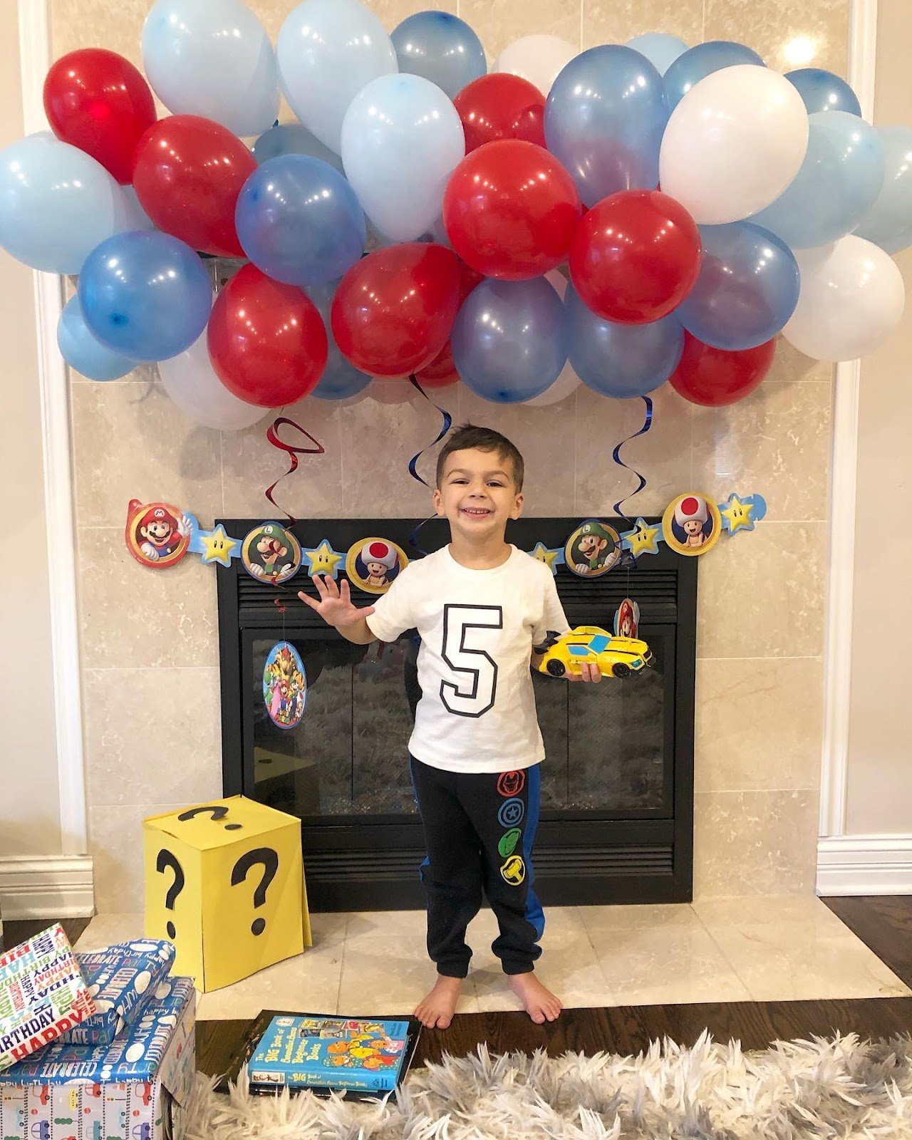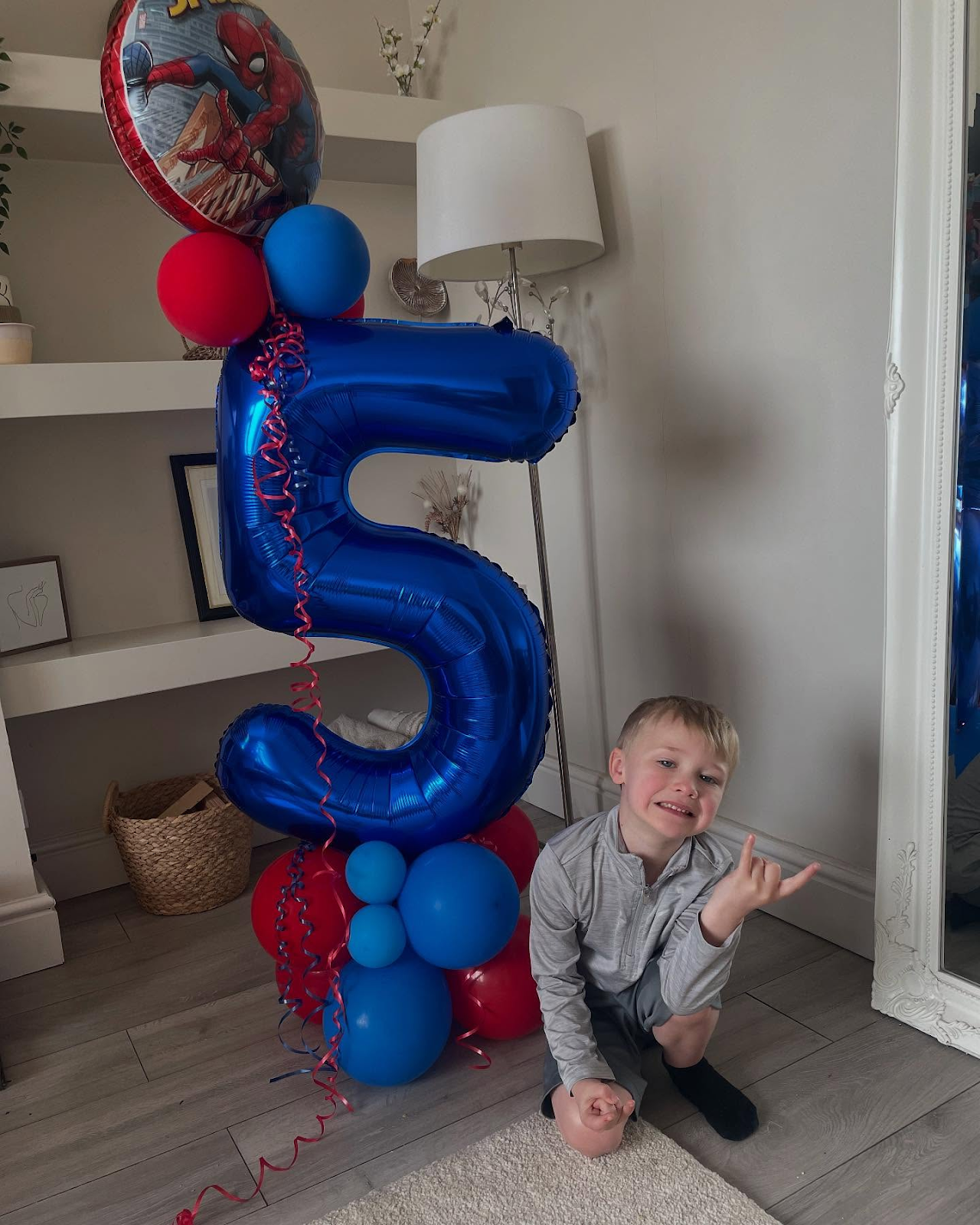 The vibrant balloons and birthday decorations bring the scene to life, capturing the happiness and energy of a young boy on his special day. It’s an excellent way to highlight the joy of turning five colorfully.