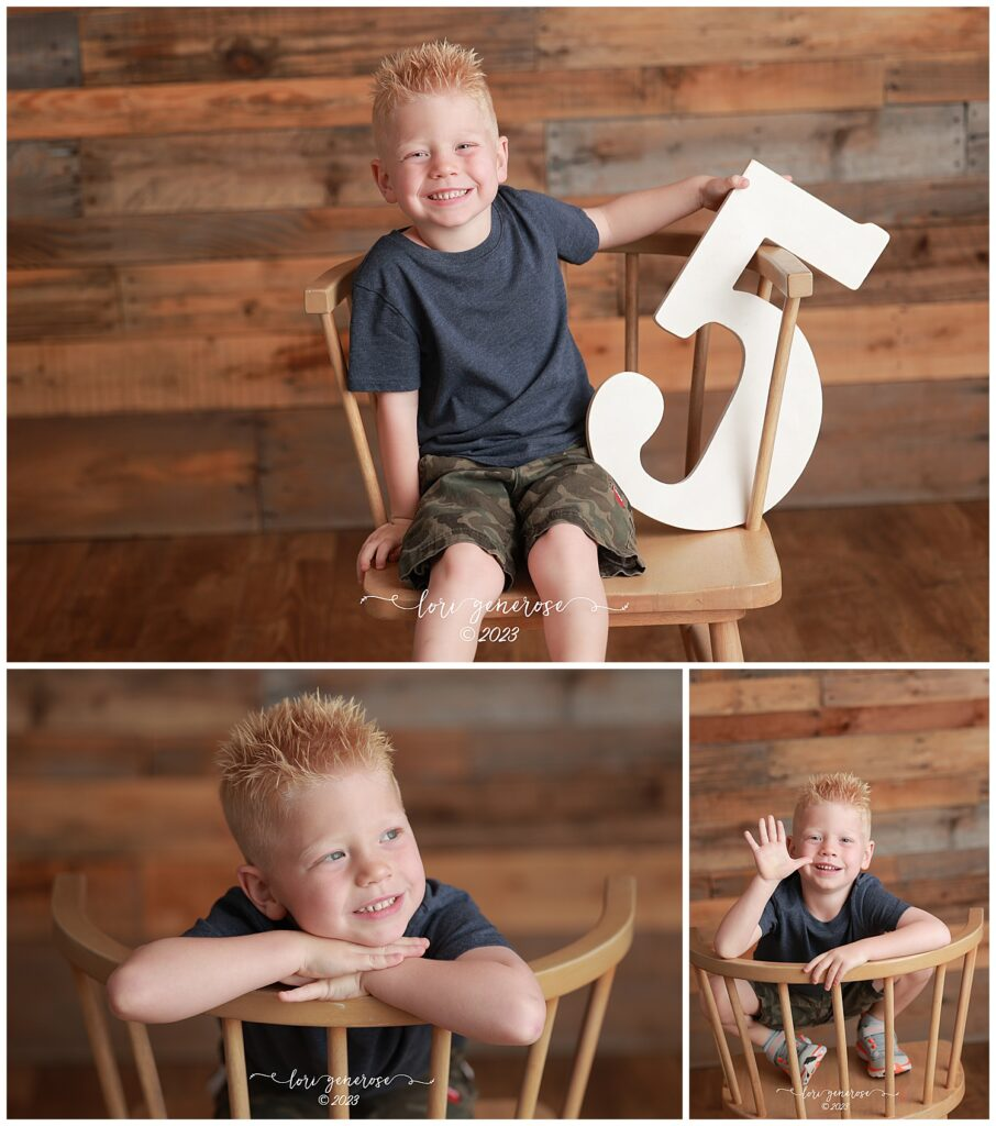 This charming birthday photoshoot features a young boy sitting on a wooden chair with a big “5” in his hand. His big smile and spiky blonde hair perfectly complement his playful demeanor. The simple wooden chair and clean background keep the focus on the boy and his joyful expression, while the “5” balloon adds an extra touch of celebration to the scene.