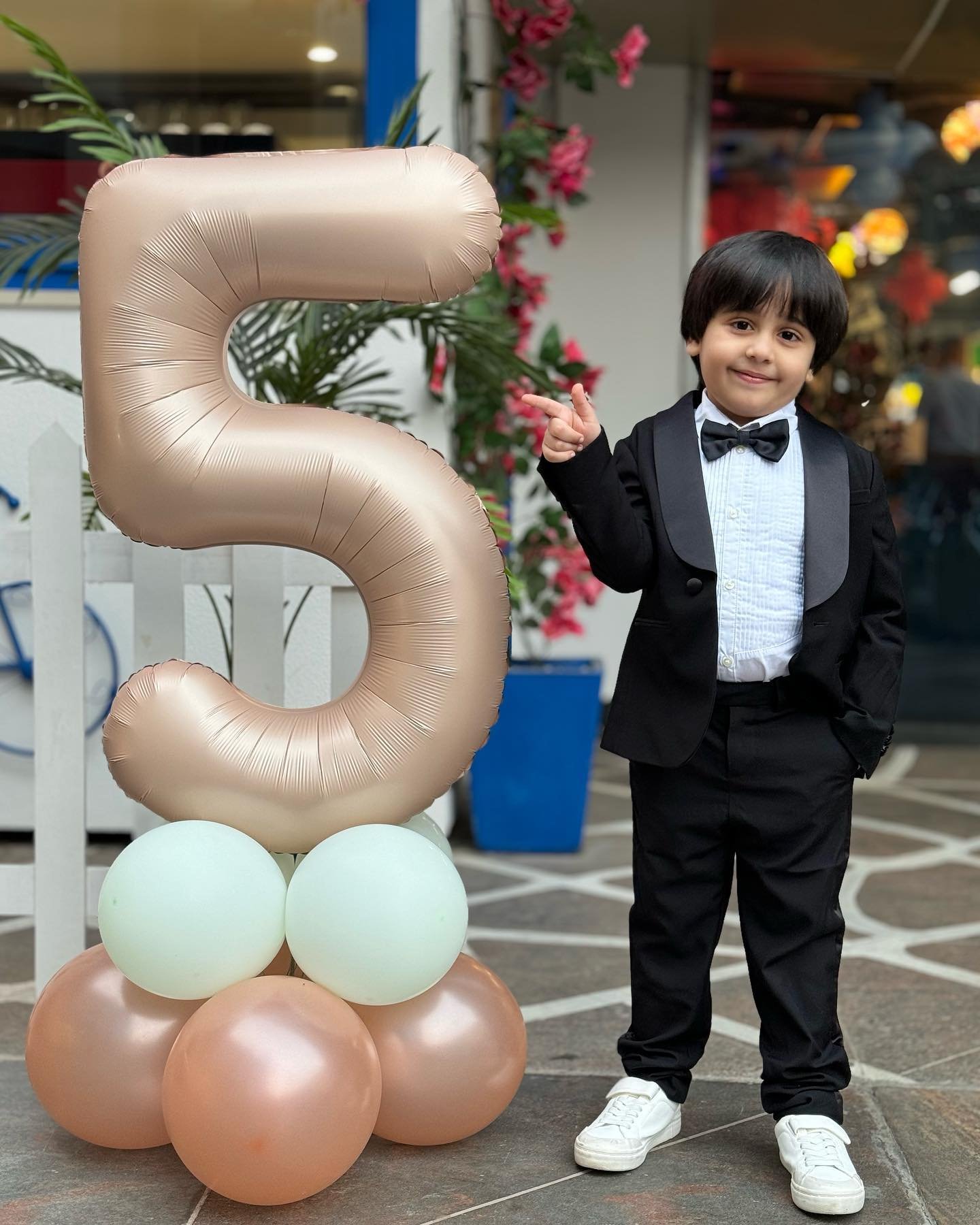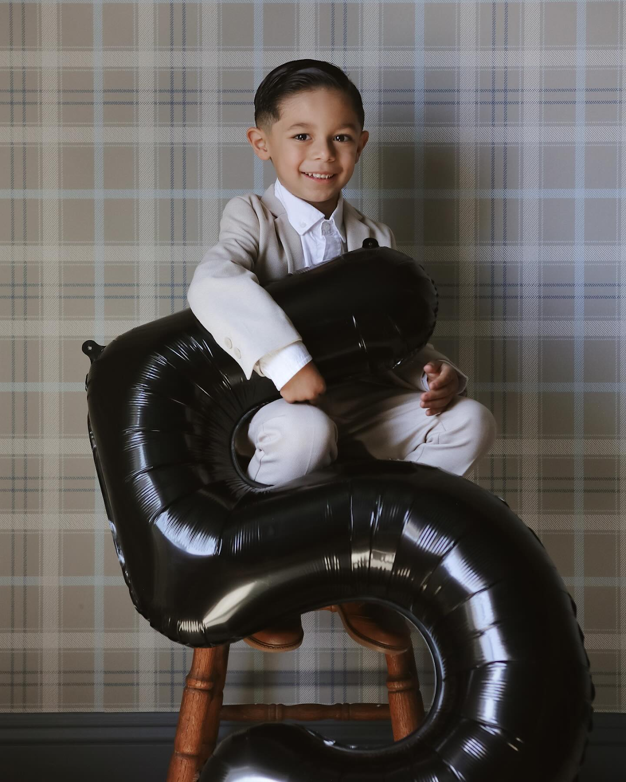 In this stylish photoshoot, a young boy is dressed in a light beige suit and white shirt, giving off a sophisticated look on his special day. He holds a shiny black balloon shaped like the number “5” and sports a charming smile. The elegant backdrop and his crisp outfit make this image feel timeless and refined. It’s perfect for parents who want their child’s birthday photos to reflect a sense of class while keeping it fun.