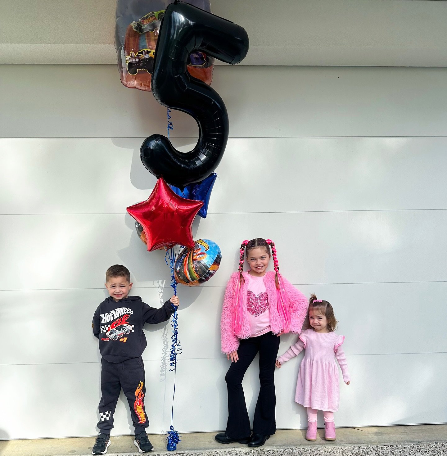 A sibling photoshoot brings out the love and joy in any birthday celebration. Here, the siblings pose together with colorful balloons and festive decorations in the background. The bright “5” balloon adds an extra touch of celebration, while the kids’ coordinated outfits add to the fun.