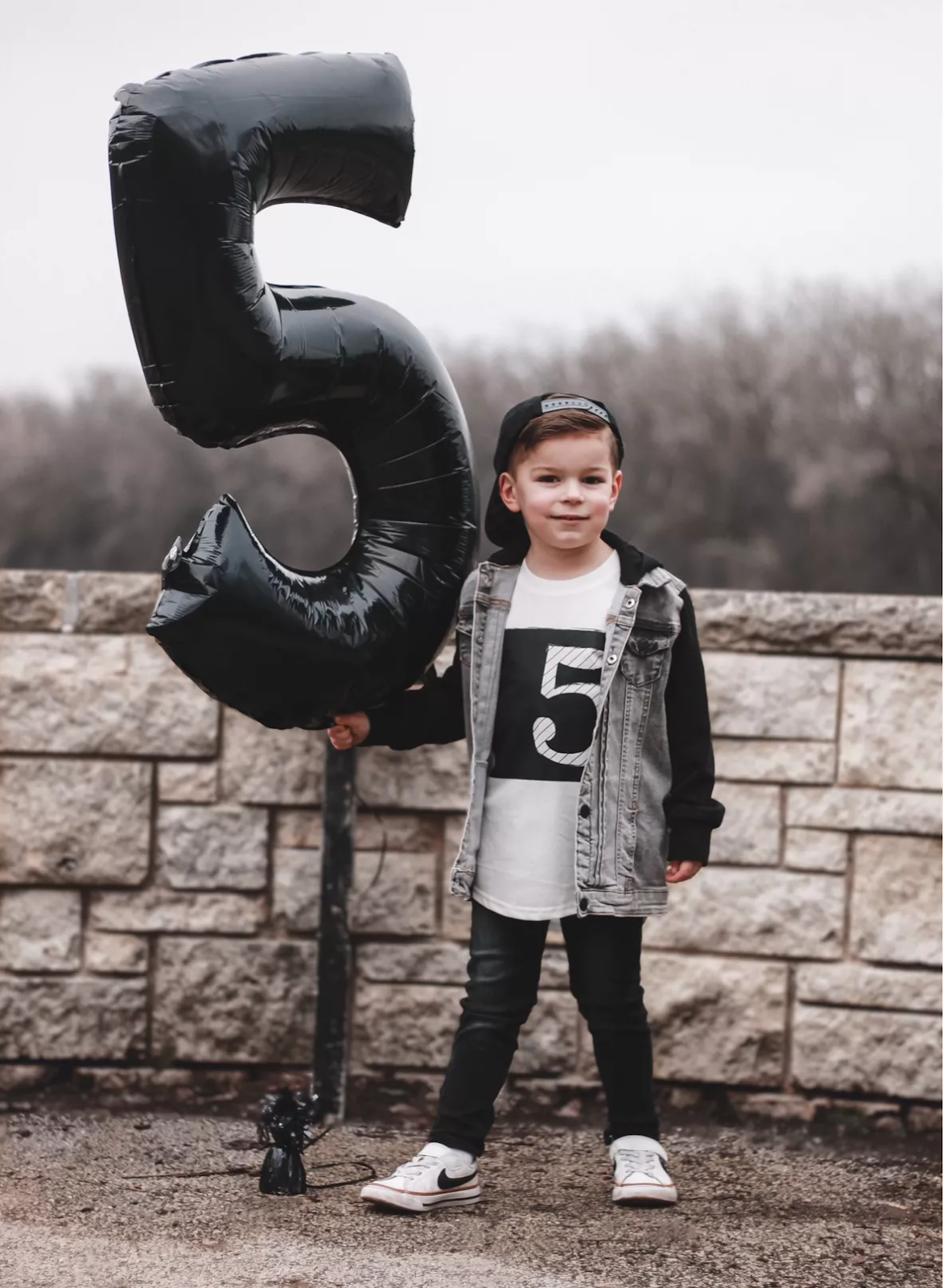 This birthday photoshoot captures a fun and stylish vibe for a 5-year-old. The oversized black balloon shaped like the number 5 makes the perfect prop. With a casual outfit and confident pose, the photo feels natural and modern for parents wanting memorable shots.