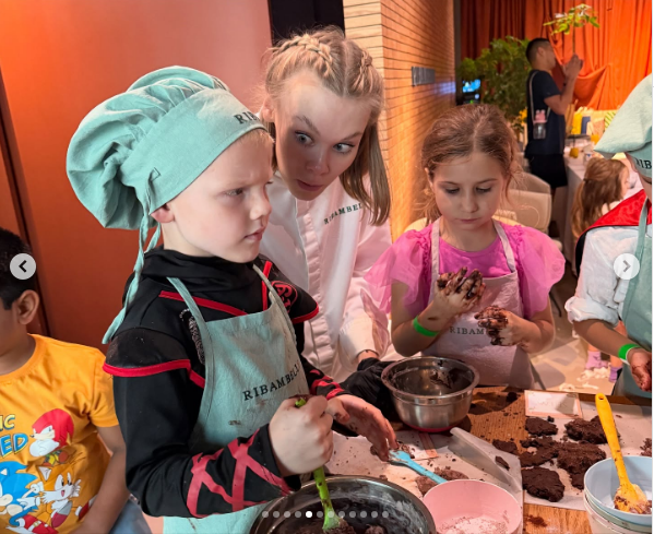 The third photo features three siblings sharing a cute moment on a couch. Another image highlights a group of kids engaged in an activity, with a smiling adult overseeing the fun. Lastly, a cooking activity shows young chefs experimenting in the kitchen, creating a delightful birthday atmosphere.