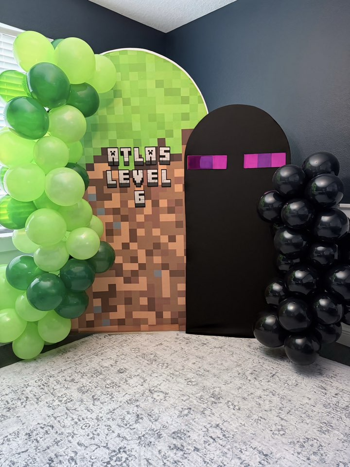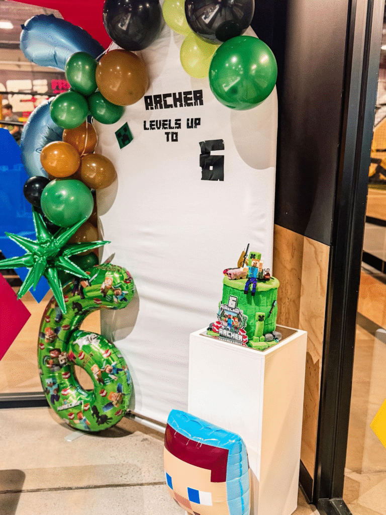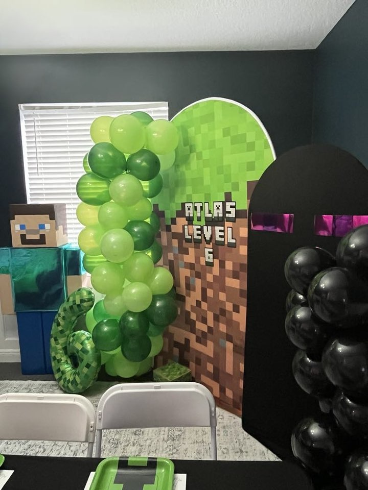 A Minecraft-inspired cake sits prominently with a figure of a character perched on top, further embracing the video game’s blocky, pixelated aesthetic. A large inflatable Minecraft head adds fun decor, making it an immersive experience for any young gamer.