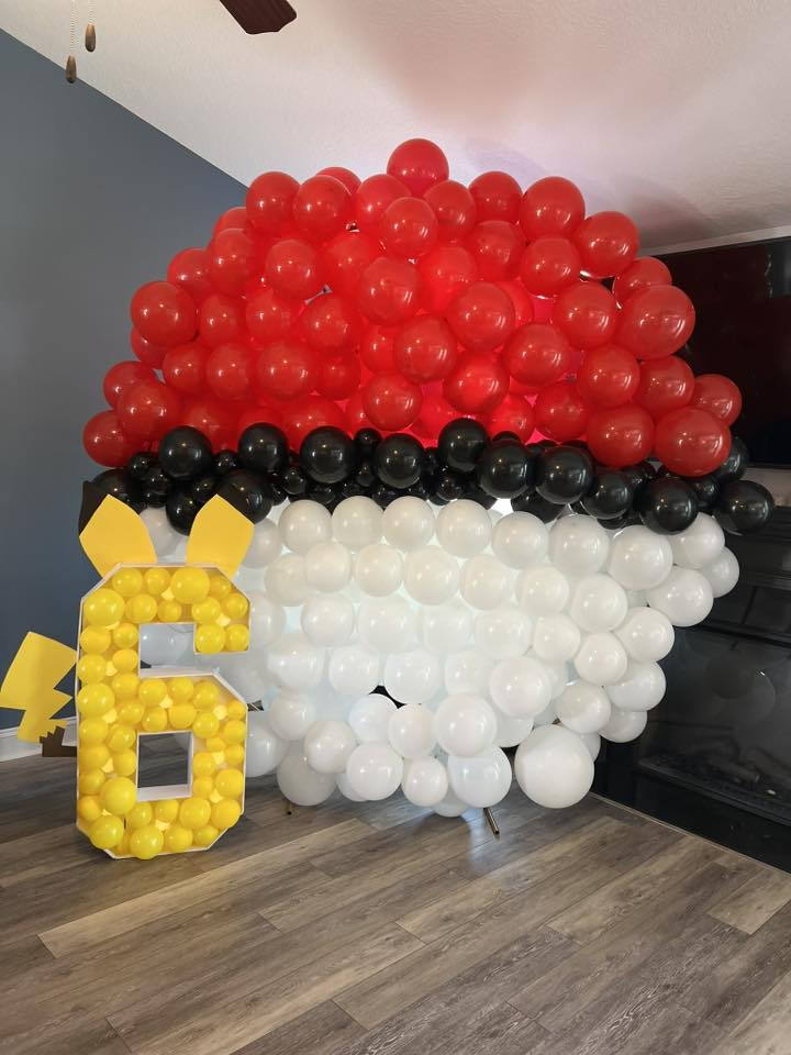 The images capture a Pokémon-themed birthday celebration filled with vibrant decor and sweet treats. One showcases a massive Pokémon-themed balloon arch with a Pikachu-shaped “6” and a Pokéball design. A tower of colorful cupcakes, each topped with Pokémon-inspired decorations, adds to the fun.