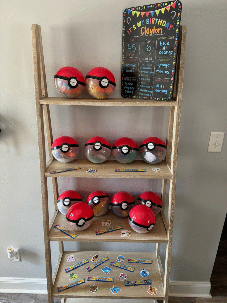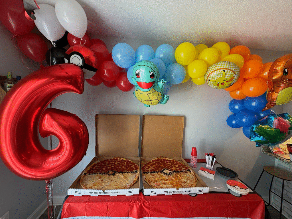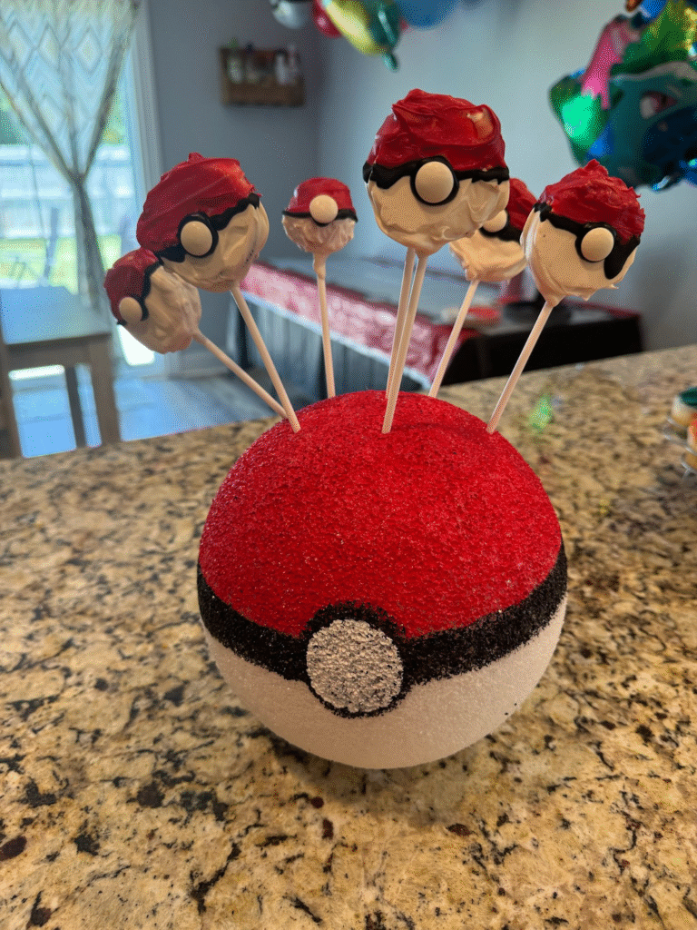 Another photo shows a lively party scene with a large red “6” balloon and themed pizza plates, while a set of cake pops shaped like Pokéballs adds a delicious twist. The final image features a display of Pokéball-themed party favors, bringing the party’s Pokémon vibe to life.
