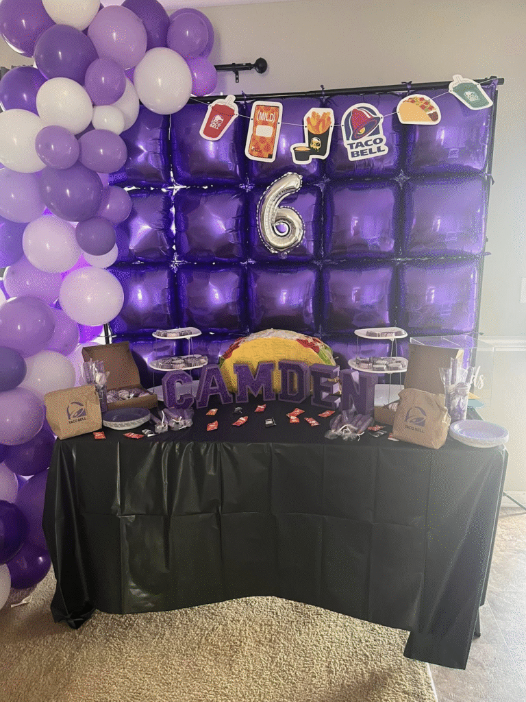 There’s also a fun Taco Bell-themed table featuring Taco Bell branding and purple accents that give the party a unique flair. The colorful theme and fun food options make this a standout birthday celebration.