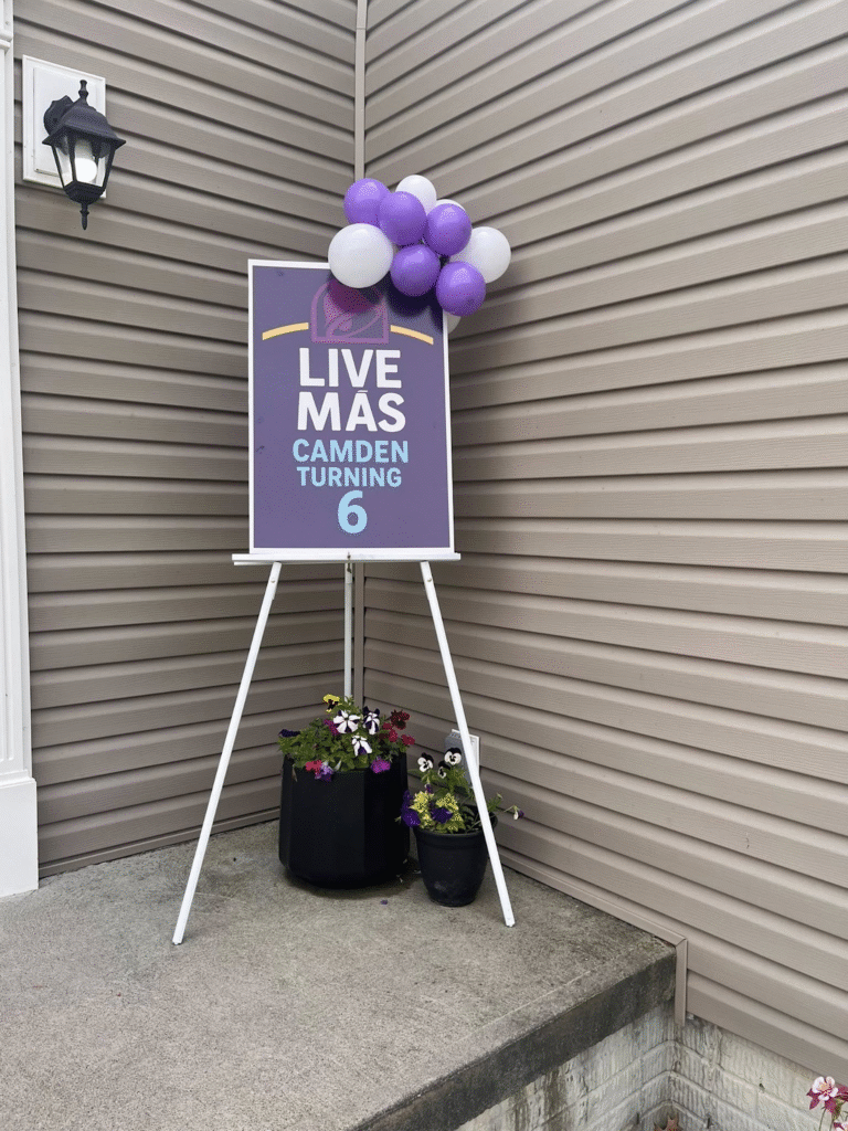 These images highlight a vibrant Taco Bell-themed birthday celebration. One features a colorful table setup with Taco Bell-inspired decor, including a purple balloon arch and a personalized sign with the birthday child’s name and the “6” milestone. The next image showcases an outdoor sign adorned with matching purple balloons, announcing the event.