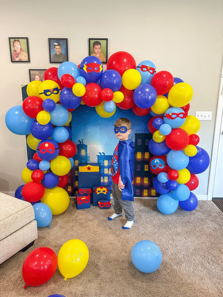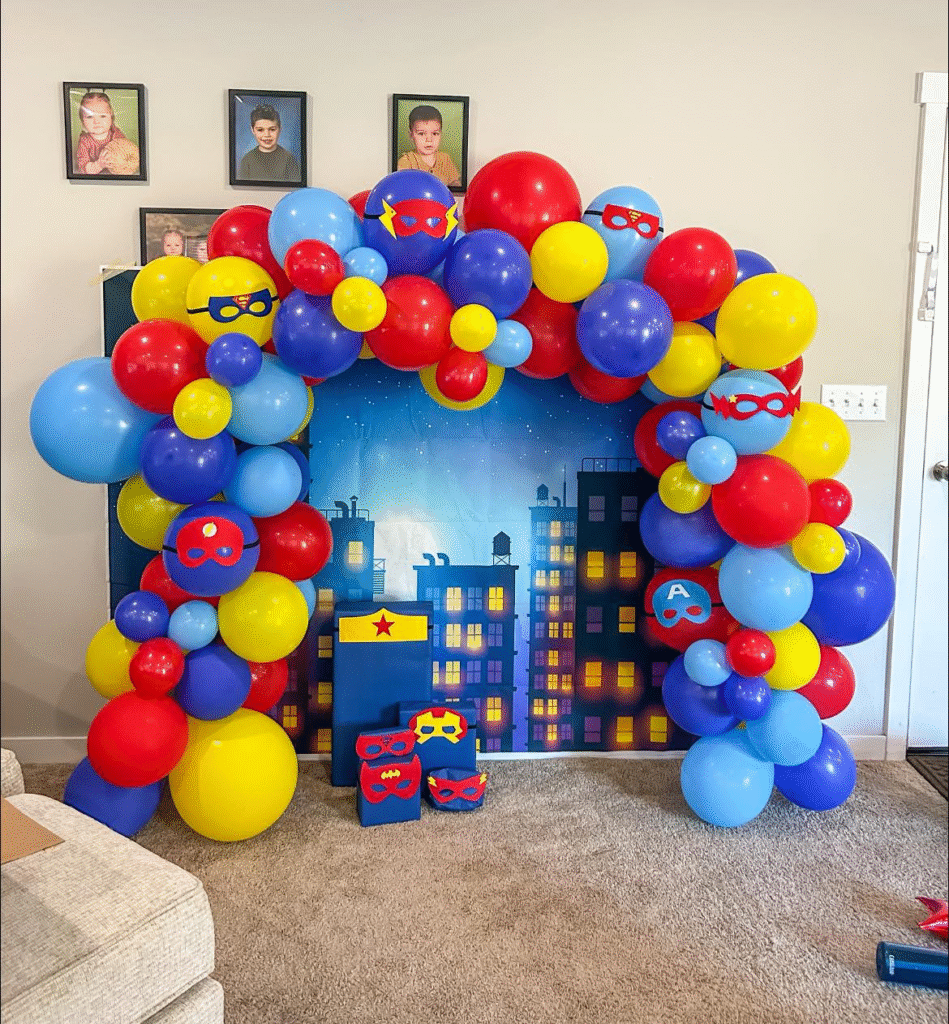 The images capture a lively superhero-themed birthday party. One shows a vibrant balloon arch in red, yellow, and blue with superhero cutouts. The birthday child, wearing a cape and mask, strikes a pose under the colorful display. Another image highlights a superhero-themed decoration, featuring large boxes with superhero faces, and a cityscape backdrop.