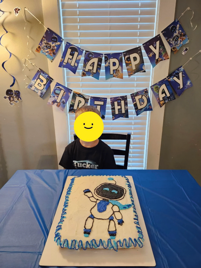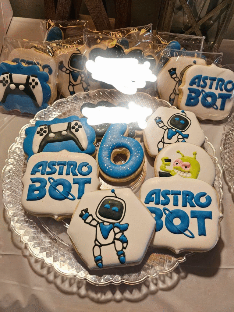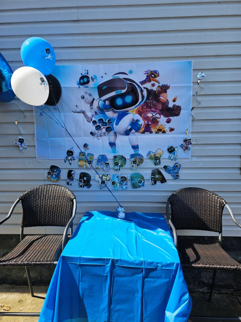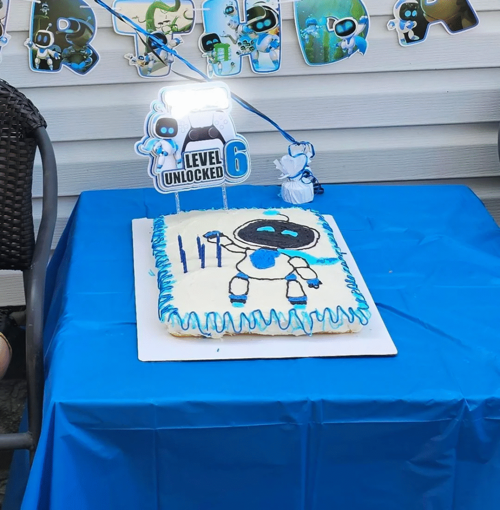 These images capture a lively Astro Bot-themed birthday party, perfect for young fans of the character. One photo showcases a personalized cake with an Astro Bot design, celebrating the milestone of “Level 6 Unlocked,” surrounded by blue decorations.