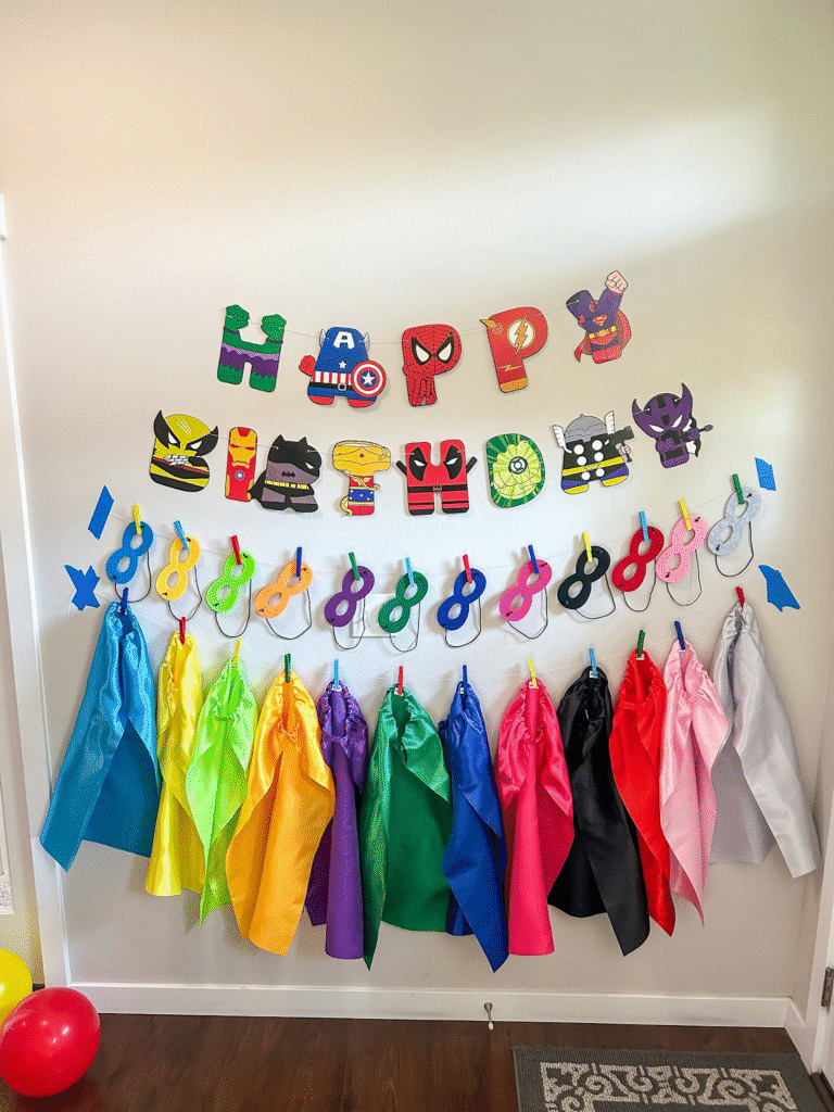 The other shows a wall with superhero masks and capes hanging for party guests, ready to dress up. A fun birthday cake, decorated with superhero figures, completes the exciting scene, bringing the theme to life.