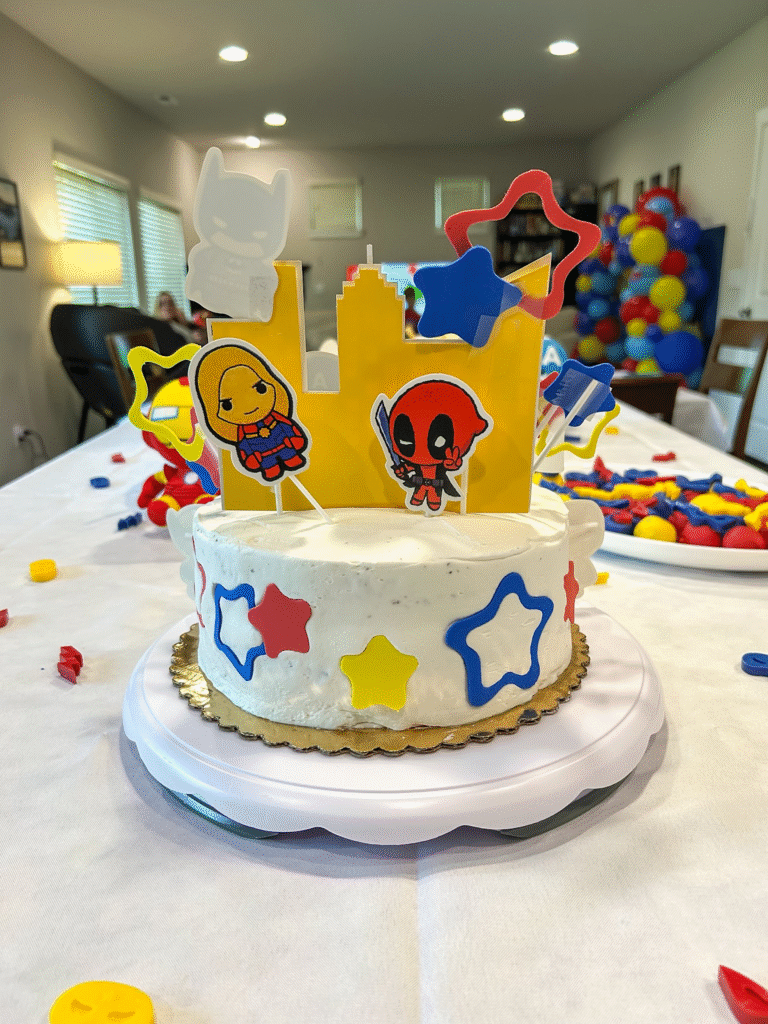 Why these images stand out: The colorful, interactive superhero decor and fun cake make these images an ideal choice for an energetic, action-packed birthday celebration for kids.